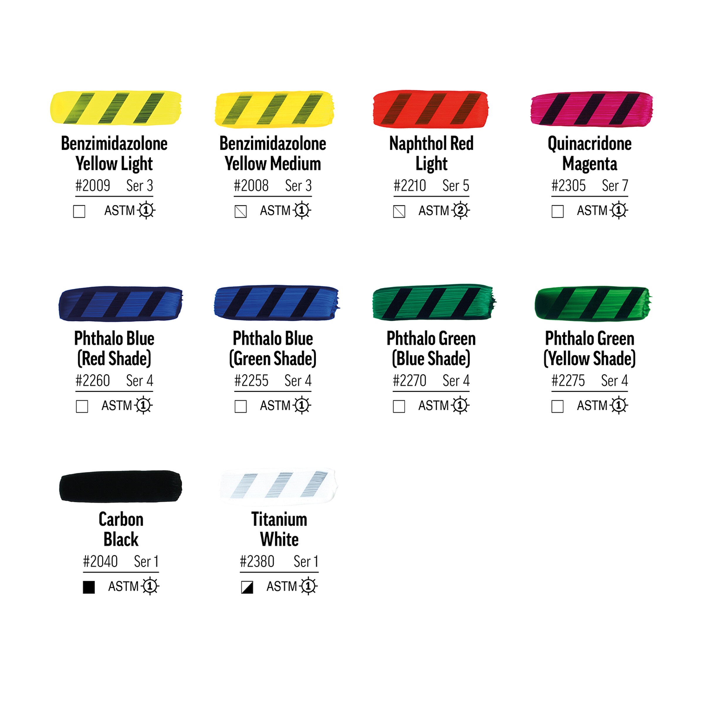 Das Set enthält die Farbtöne Benzimidazolone Yellow Light, Benzimidazolone Yellow Medium, Naphthol Red Light, Quinacridone Magenta, Phthalo Blue (Red Shade), Phthalo Blue (Green Shade), Phthalo Green (Blue Shade), Phthalo Green (Yellow Shade), Carbon Black und Titanium White.