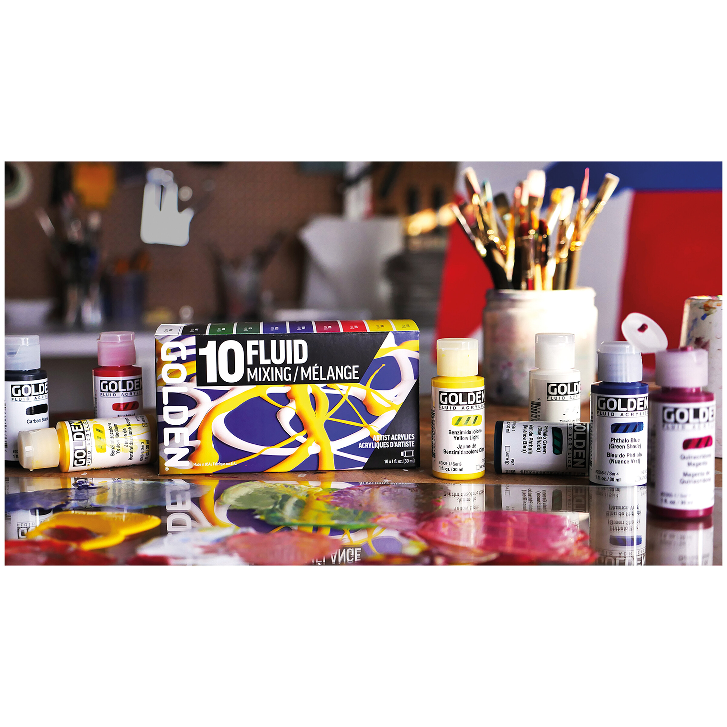 Golden Fluid Acrylics weisen eine sahneartige Konsistenz auf. Die hochpigmentierten Farben enthalten keine Zusatzstoffe wie z. B. Mattierungsmittel oder Füllstoffe, woraus eine hohe Brillanz resultiert. Fluid Acrylics sind lichtecht, alterungsbeständig und flexibel. Die Farben weisen eine gleichmässig fliessende Viskosität auf und eignen sich hervorragend für Detailarbeiten, Trockenpinseltechniken und Lasuren. Sie können mit dem Pinsel vermalt, gegossen oder gesprüht werden. Beim Hinzufügen von zusätzlichem Wasser bleibt die Qualität der Farbe erhalten.