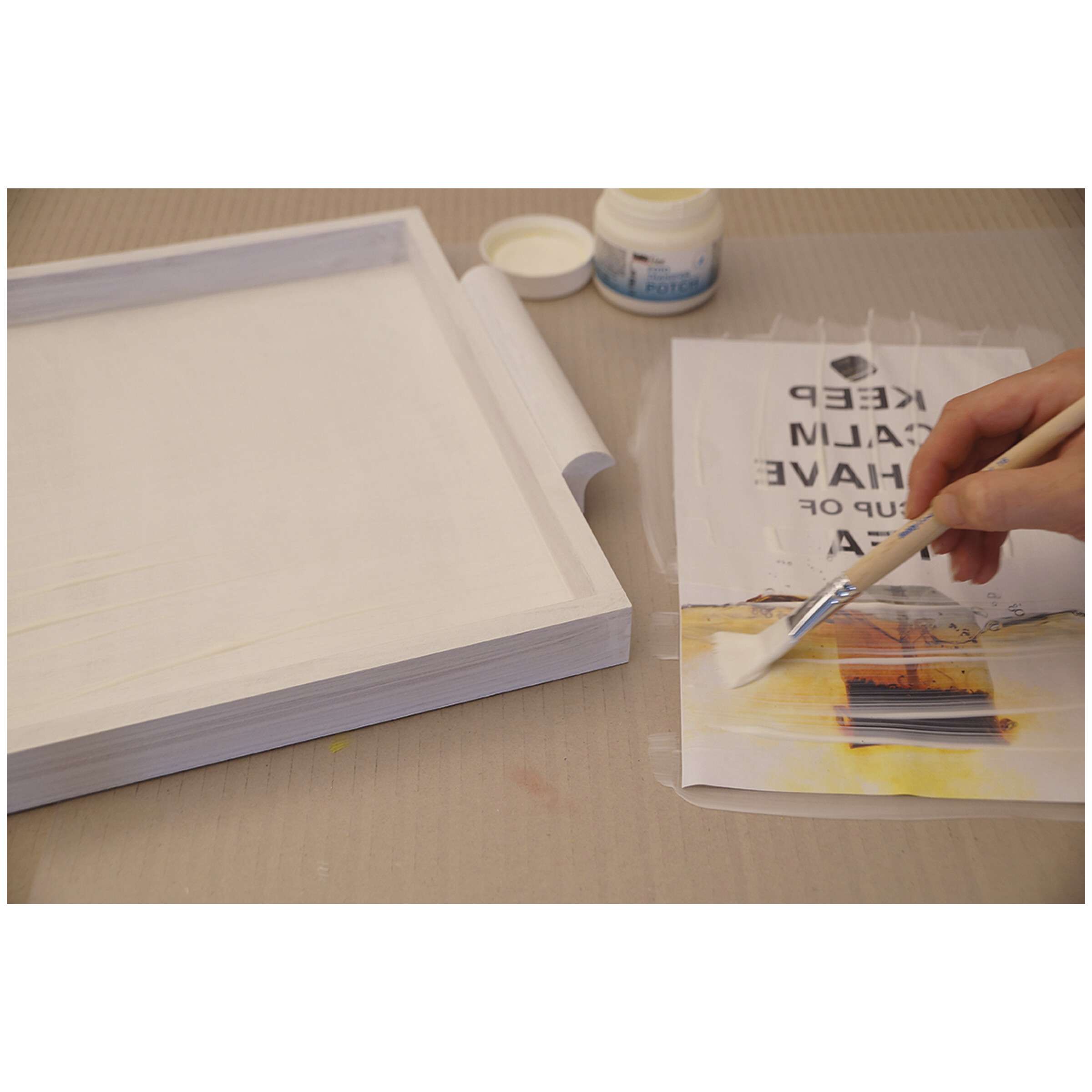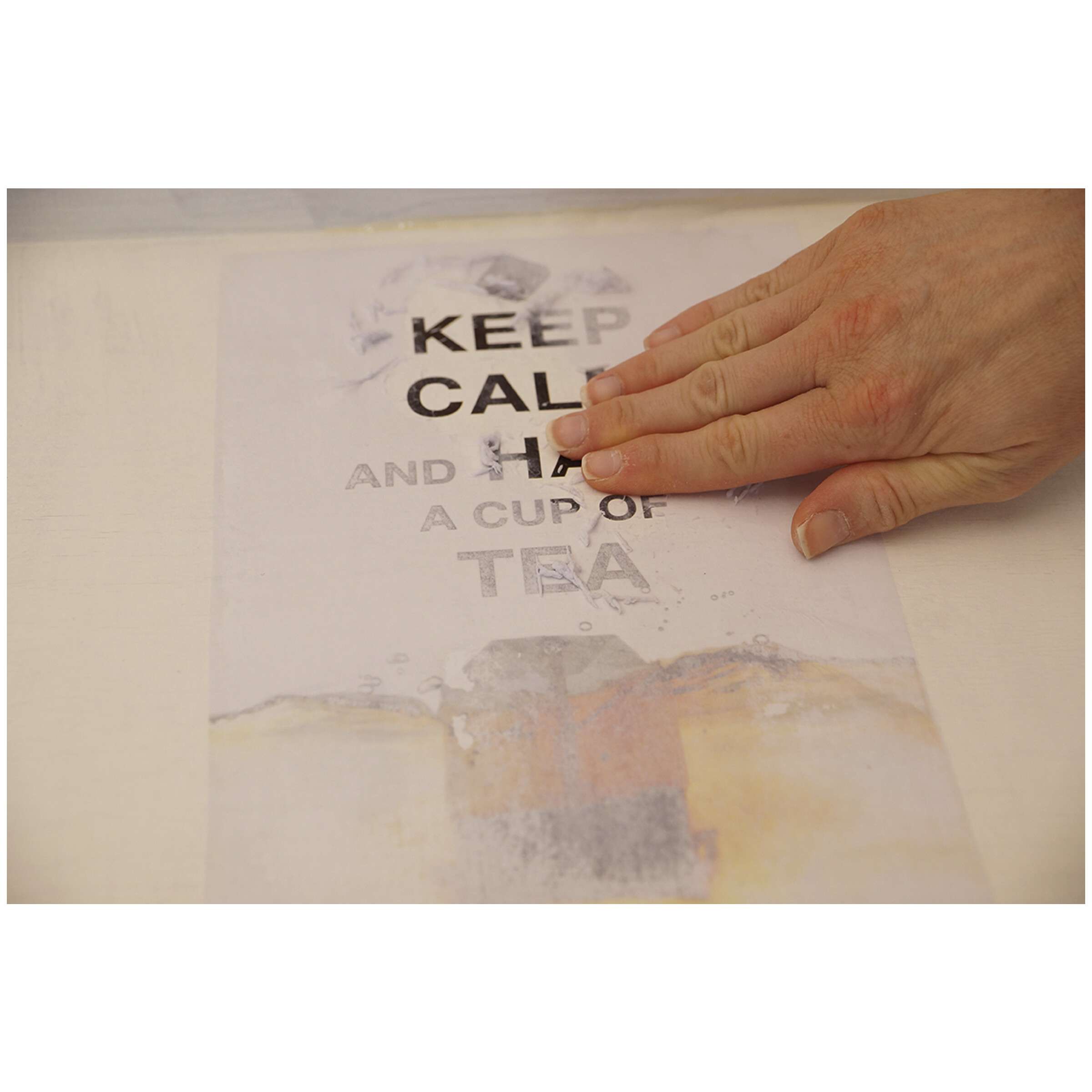 Mit dem Transfermedium auf Wasserbasis lassen sich Ausdrucke und Kopien aus dem Laserdrucker sowie Zeitungsausschnitte auf unterschiedlichste Untergründe wie Keilrahmen, Holz, Keramik, Metall, Glas, Porzellan oder Stoff (nur Handwäsche)...