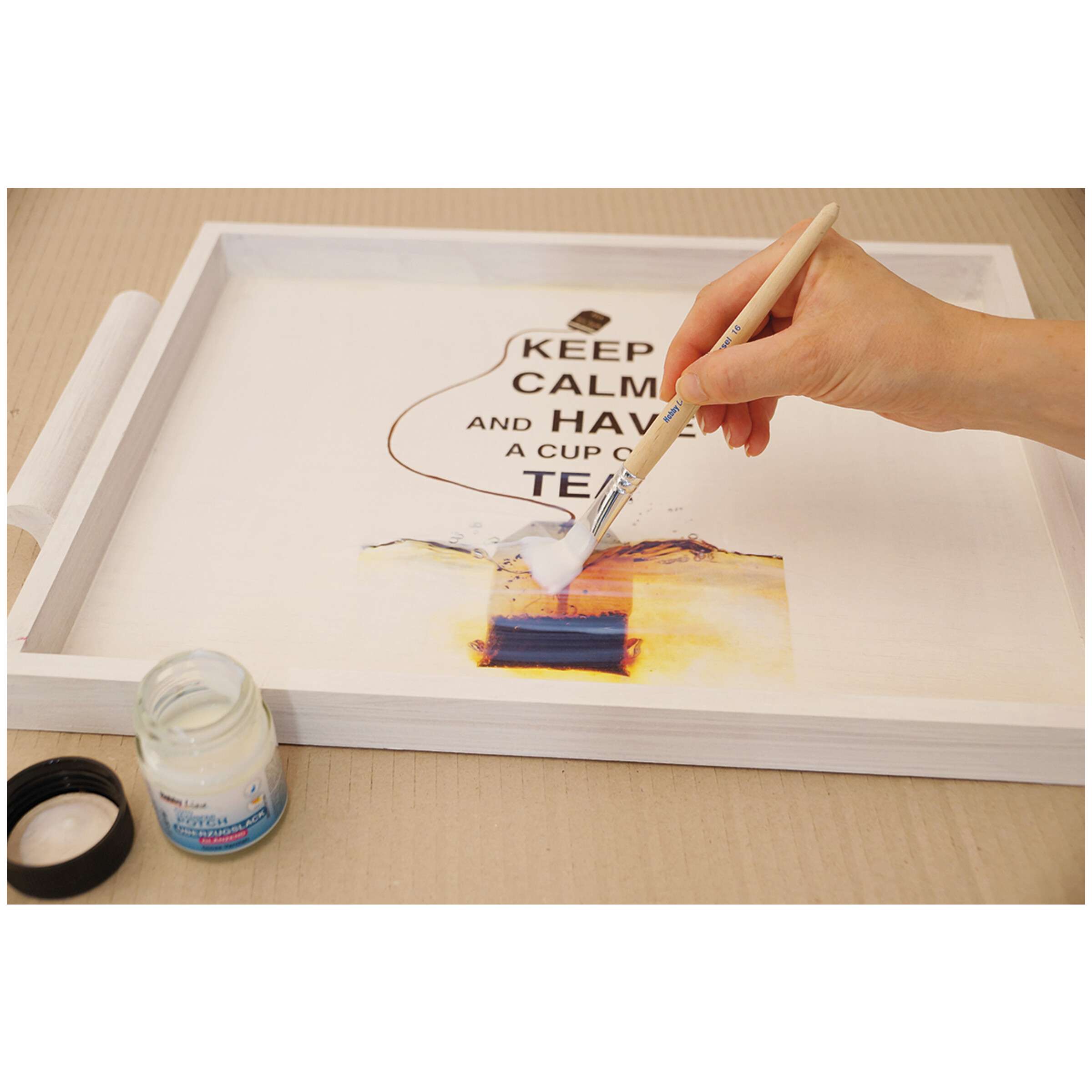 Mit dem Transfermedium auf Wasserbasis lassen sich Ausdrucke und Kopien aus dem Laserdrucker sowie Zeitungsausschnitte auf unterschiedlichste Untergründe wie Keilrahmen, Holz, Keramik, Metall, Glas, Porzellan oder Stoff (nur Handwäsche) übertragen. Das Produkt trocknet transparent und seidenglänzend auf, ist vegan, wetterfest und auf saugfähigen Untergründen nach dem Trocknen wasserfest. Ideal für die Umsetzung anspruchsvoller Collagen und die Kombination von Fotomotiven mit Acrylfarben, Mixed-Media-Techniken und Schablonierungen. Die Flasche besteht aus Recyclingmaterial und verfügt über ein praktisches Ausgießsystem sowie eine große Öffnung für breite Pinsel.