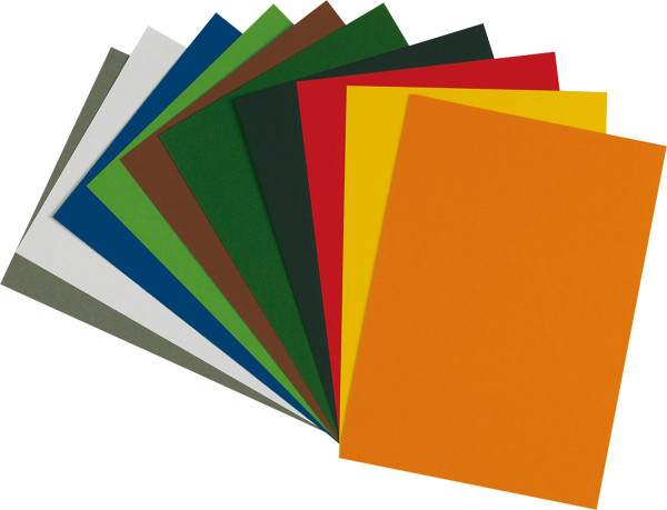 Enthält je 10 Bogen Weiß, Sonnengelb, Dahliengelb, Ming Rot, Mitternachtsblau, Tannengrün, Blattgrün, Steingrau, Schokobraun und Schwarz.