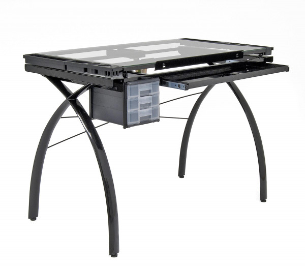 Der Zeichentisch überzeugt durch anspruchsvolles und funktionales Design. Die stabile Stahlkonstruktion mit geschwungenen Füßen trägt eine solide Platte aus gehärtetem Sicherheitsglas. Mit einer Vielzahl an Fächern, Schubladen und flexibel verschiebbaren Stifthaltern bietet der Tisch viel Platz für die übersichtliche und griffbereite Aufbewahrung von Zeichenutensilien. Er erlaubt eine Winkeleinstellung von 0 bis 35 Grad, verstellbare Füße gewährleisten sicheren Stand.