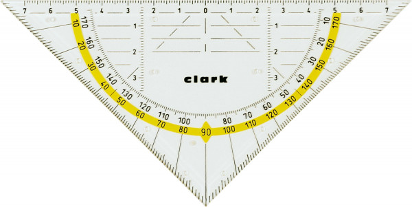 Aus hochwertigem, transparenten Kunststoff mit gegenläufiger, gelb hinterlegter Grad-Skala. Hypotenuse 16 cm.