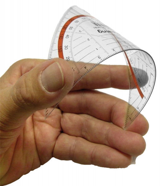 Kombizeichengerät für die Schule, glasklarer Kunststoff, unzerbrechlich, mm-Teilung, Halbkreiswinkelmesser mit Doppelbezifferung (eine Skala farbig unterlegt), Markierungen für Parallelen. Farblich sortiert. Hypothenuse 16 cm.