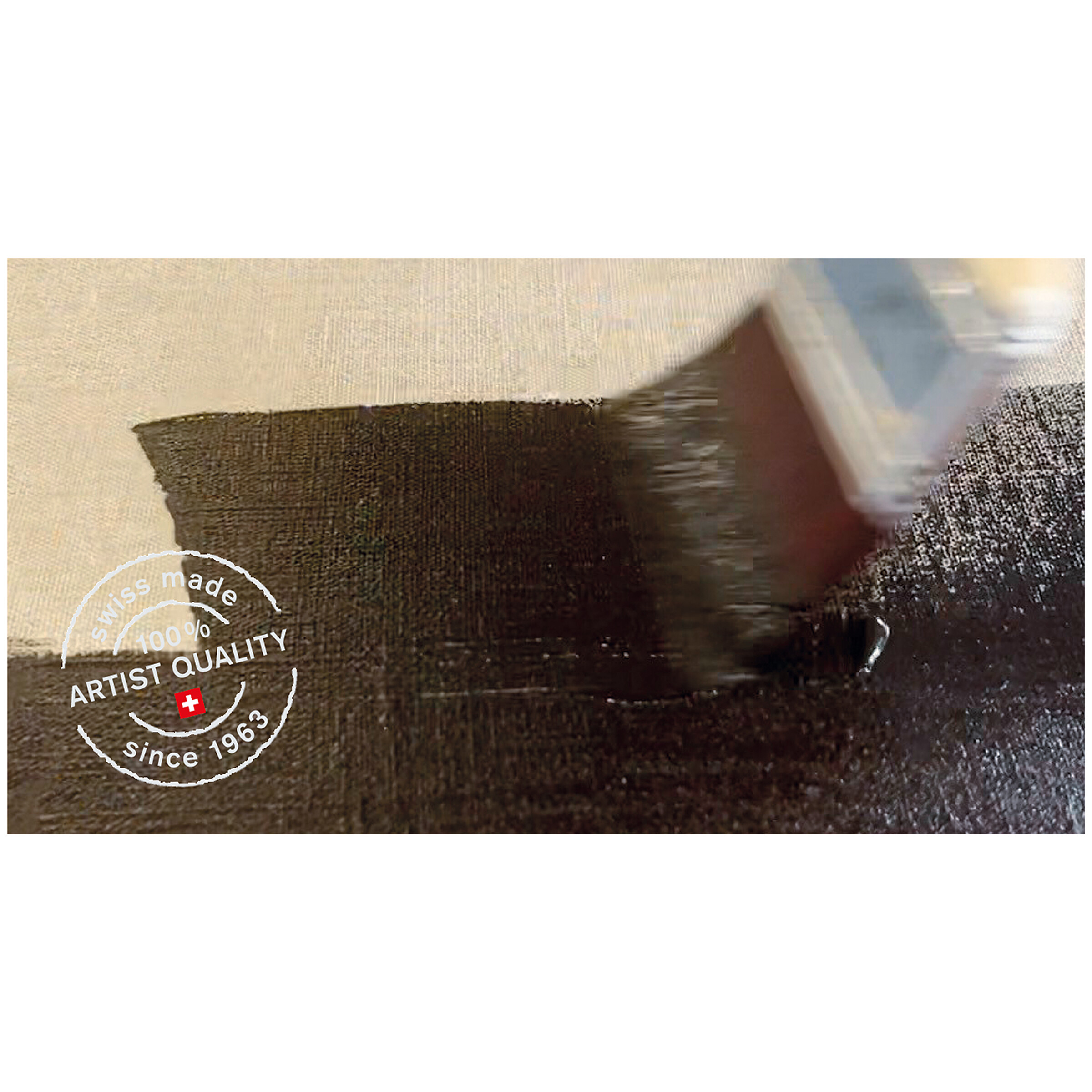 Die tiefschwarze, feinporige Acryl-Halbkreidegrundierung ergibt einen halbsaugenden, matten Malgrund, der deckende Farben besonders brillant wirken lässt. Gesso black ist hochdeckend, licht- sowie alterungsbeständig, lässt sich hervorragend streichen und gleichmäßig auftragen. Die Grundierung ist konzentriert und ergiebig (50−100 ml/m²), wasserverdünnbar, nach dem Trocknen wasserfest, gut schleifbar und dauerelastisch. Gesso black eignet sich für alle saugenden Untergründe wie Leinwände, Papier, Karton, Holz, Faserplatten, Keramik etc. sowie für Acryl-, Öl-, Aquarell-, Tempera- und Alkydmalerei.