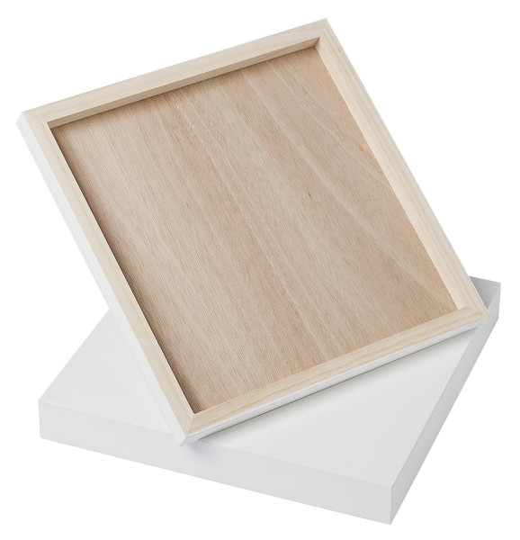 Die 5 mm starke, planlagige Malplatte aus MDF ist zweifach mit weißer, säurefreier Universalgrundierung beschichtet (vorderseitig sowie an den Rändern) und hervorragend für das Arbeiten mit Acryl-, Gouache-, Öl- und Pastellfarben, Farbstiften, Lack, Markern usw. geeignet. Auch für anspruchsvolle Spachtelarbeiten und Collagen bietet sie ausreichend Stabilität. Die feine Oberflächenstruktur sorgt für sehr gute Haftung. Rückseitig ist die Gesso-Malplatte mit Leisten aus Kiefernholz unterlegt. Die daraus resultierende Tiefe von 1,9 bzw. 3,8 cm ermöglicht sowohl die unmittelbare Aufhängung als auch die Rahmung mit Schattenfugenrahmen.