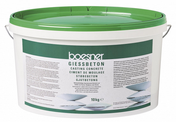 Das gebrauchsfertige Spezialzement-Gemisch hat dank seiner ausgewogenen Rezeptur ideale Verarbeitungseigenschaften und eignet sich besonders für das Gießen von Formen, komplexen Skulpturen oder großformatigen Reliefs. Hierbei entstehen Abgussmodelle mit sehr glatten, geschlossenen Oberflächen ohne Lufteinschlüsse. boesner Gießbeton bindet schnell ab, ist spannungsarm, selbstnivellierend und frostsicher. Von Natur aus ist der Beton sehr hell, kann aber durch Zugabe zementechter Pigmente eingefärbt werden. Vollständig durchgetrocknete Objekte können nach einer Vorbehandlung mit Tiefgrund farblich gestaltet werden. Besonders geeignet sind u. a. die nahezu alkalibeständigen Acrylfarben Lascaux Studio und Talens Amsterdam. Im praktischen, wiederverschließbaren 10 kg-Eimer zum Aufbewahren und Anmischen. Aufgrund des günstigen Preis-Leistungs-Verhältnisses auch sehr gut für größere Projekte geeignet.