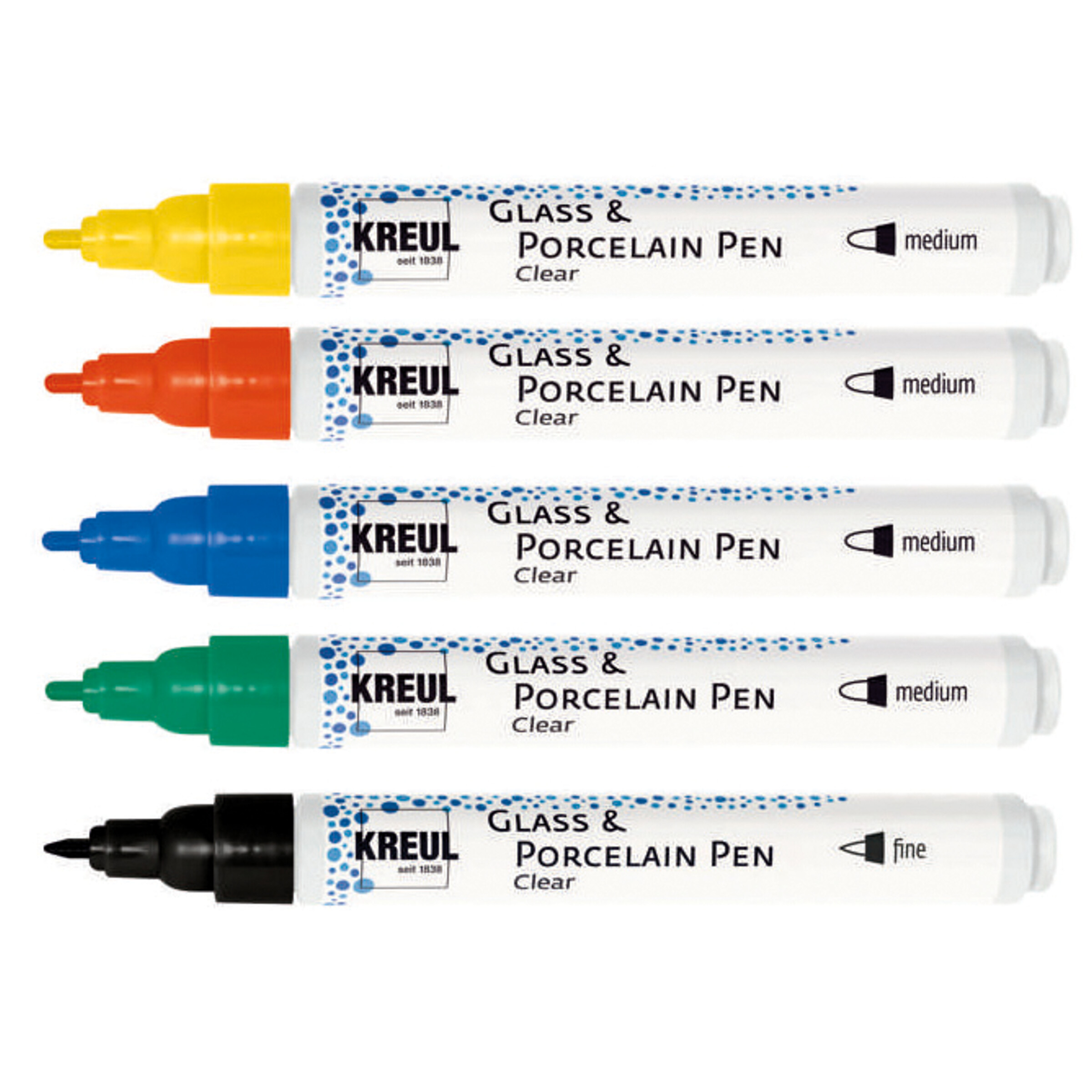 Das Set enthält vier Glass & Porcelain Pen Clear, medium (Strichbreite ca. 2–4 mm) in den Farbtönen Gelb, Rot, Blau und Grün sowie einen Glass & Porcelain Pen Clear, fine (Strichbreite ca. 1–2 mm) in Schwarz.