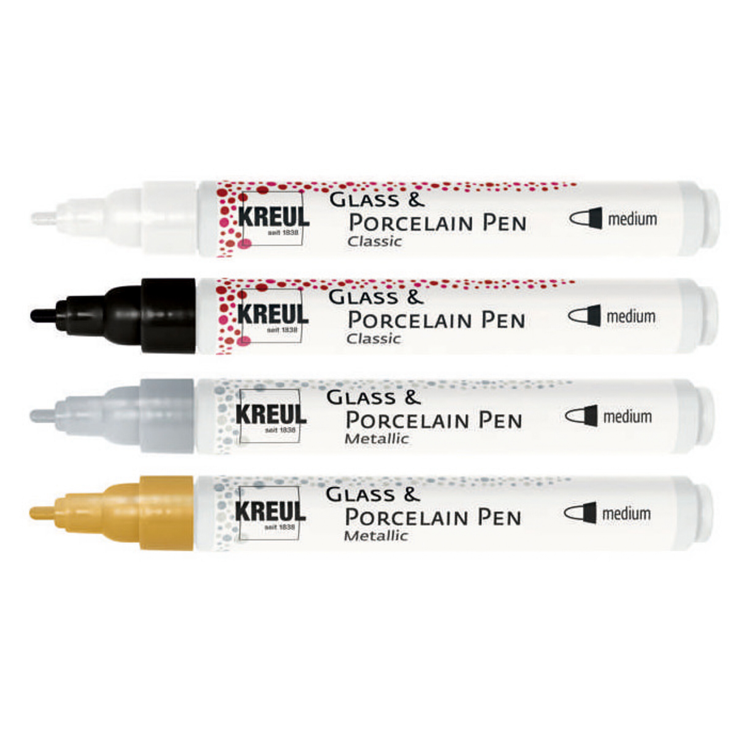 Das Set enthält zwei Glass & Porcelain Pen Classic, medium (Strichbreite ca. 2–4 mm) in Weiß und Schwarz sowie zwei Glass & Porcelain Pen Metallic, medium (Strichbreite ca. 2–4 mm) in Silber und Gold.