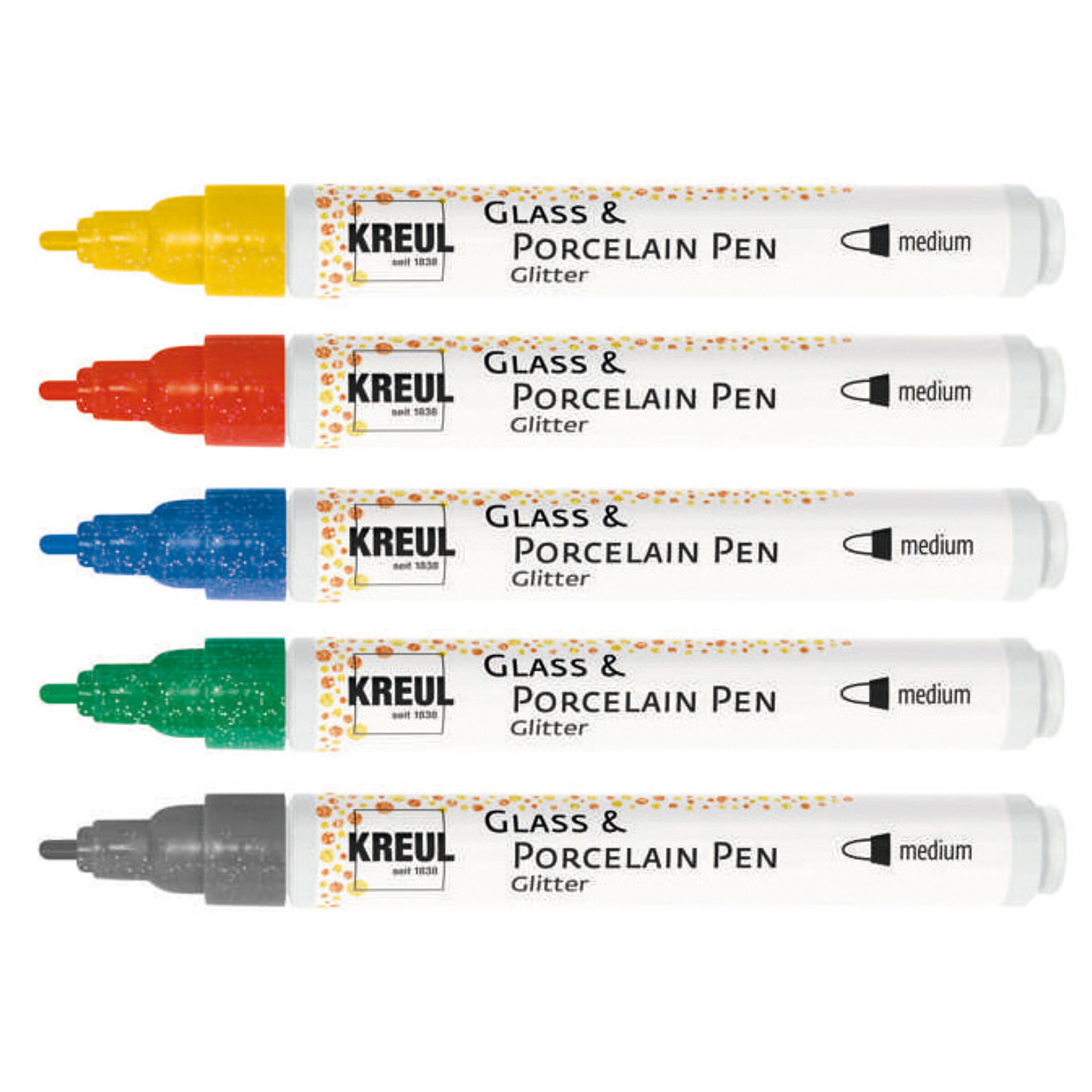 Das Set enthält fünf Glass & Porcelain Pen Glitter (Strichbreite ca. 1–3 mm) in den Farbtönen Sonnengelb, Rot, Blau, Hellgrün und Anthrazit.