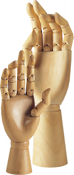 Für Bewegungsstudien, mit beweglichen Fingern. Aus transparent lackiertem Hartholz. Ausführung einer rechten und einer linken Hand, jeweils in drei Größen erhältlich. Durch Großeinkauf ist der Preis sehr günstig.