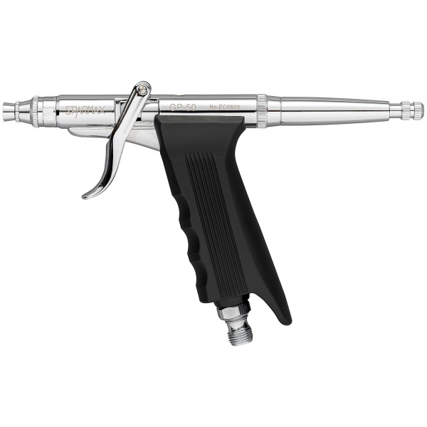 Allzweck-Spritzpistole mit Abzugshebel am Griff und seitlich angebrachten Metallbehältern (7 ml & 15 ml). Zum Anschluss an die Druckluftversorgung steht ein 1/8“-Gewinde zur Verfügung. Geeignet für alle Kompressoren und Airbrushfarben/-Inks. Die Nadelregulierung für Farbfluss und Strichstärke ist an der Spritzpistole einstellbar, der Luftmengenverbrauch kann direkt am Kompressor oder, wenn vorhanden, am Verteiler bzw. an der Schnellkupplung mit Druckregler nach Bedarf eingestellt werden.