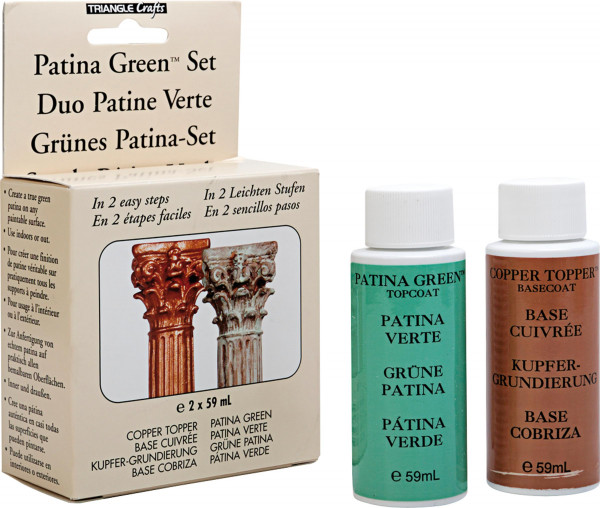 Verwenden Sie Kupfergrundierung und grüne Patina zum Anfertigen einer echten Patina auf Bilderrahmen, Holz, Gips, Keramik, Metall usw. Nach gründlicher Vorbereitung des Malgrundes werden mit 10-minütigem Abstand zwei Schichten Kupfergrundierung und danach auf den noch leicht klebrigen Untergrund, die grüne Patina mit Pinsel oder Schwamm, aufgetragen.