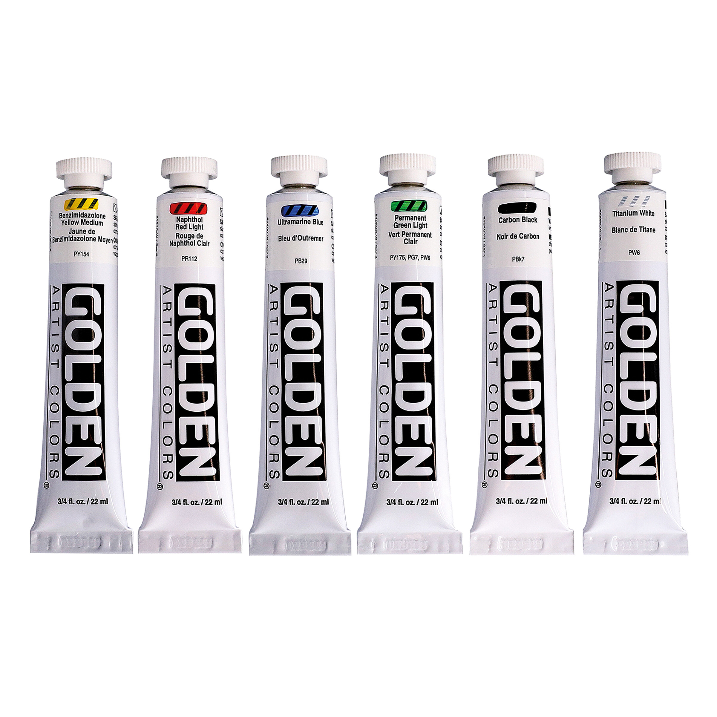 Das Set enthält die Farbtöne Benzimidazolone Yellow Medium, Naphthol Red Light, Ultramarine Blue, Permanent Green Light, Carbon Black und Titanium White.