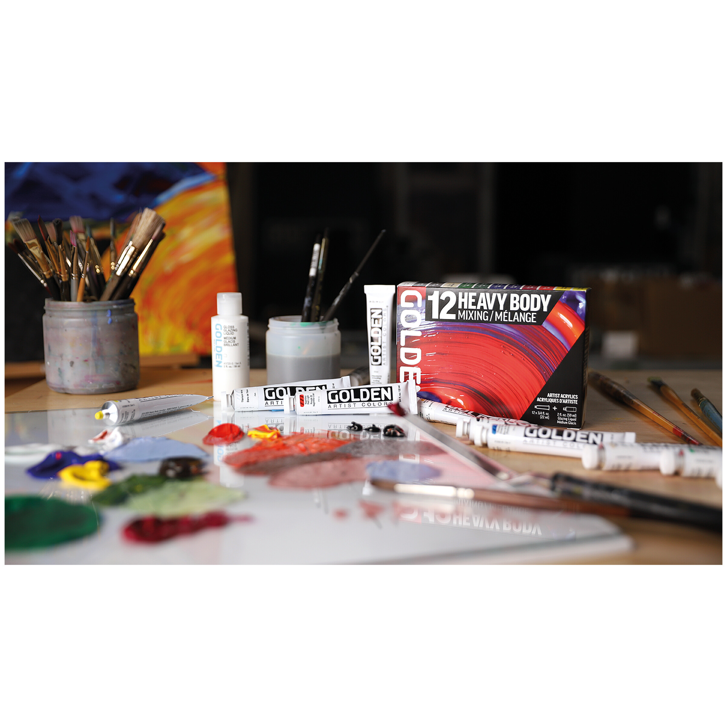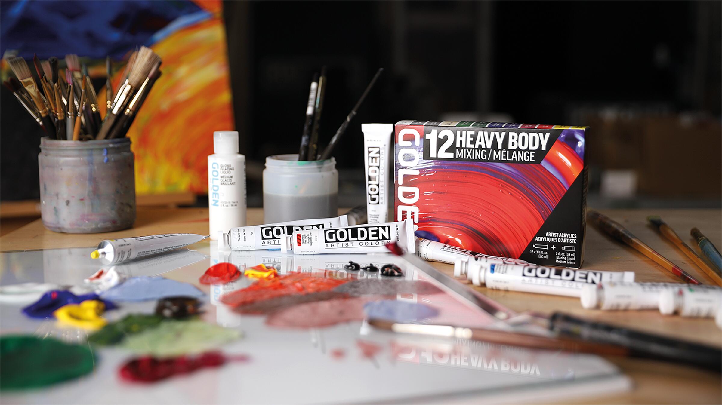 Golden Heavy Body Acrylics sind für ihre außergewöhnlich glatte, butterweiche Konsistenz bekannt. Die hochpigmentierten Farben bestehen aus reinen Pigmenten in einer 100%igen Acrylemulsion. Golden Heavy Body Acrylics sind lichtecht, alterungsbeständig und enthalten keine Zusätze wie bspw. Mattierungsmittel, somit ist der Glanzgrad jeder Farbe unterschiedlich. Dank der schweren, cremigen Struktur lassen sich sehr gut Impasto-Effekte gestalten. Das umfassende Sortiment an Golden Hilfsmitteln ermöglicht eine fast unbegrenzte Modifizierung der Farben hinsichtlich der Konsistenz, der Transparenz, der Trockenzeit oder des Glanzgrades.