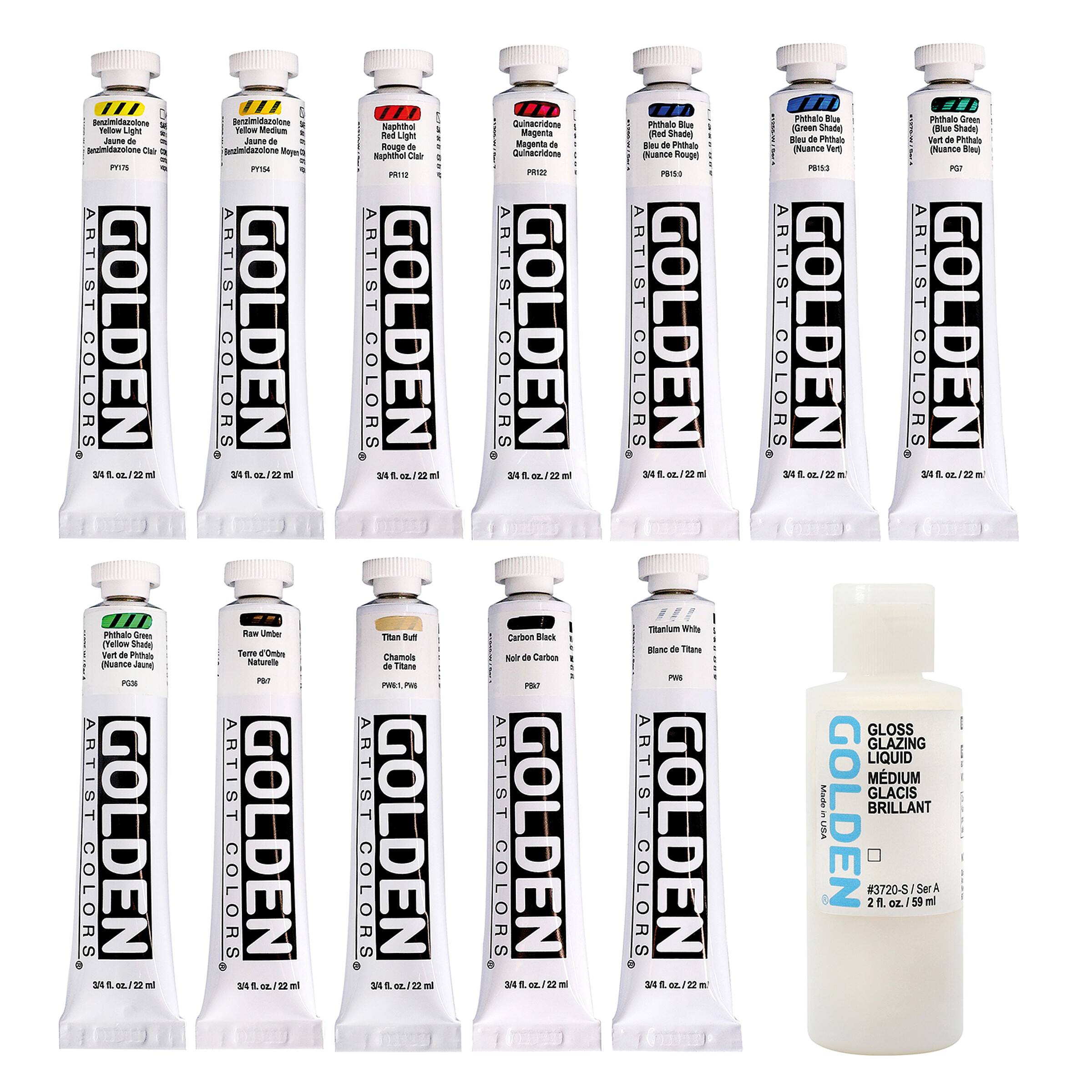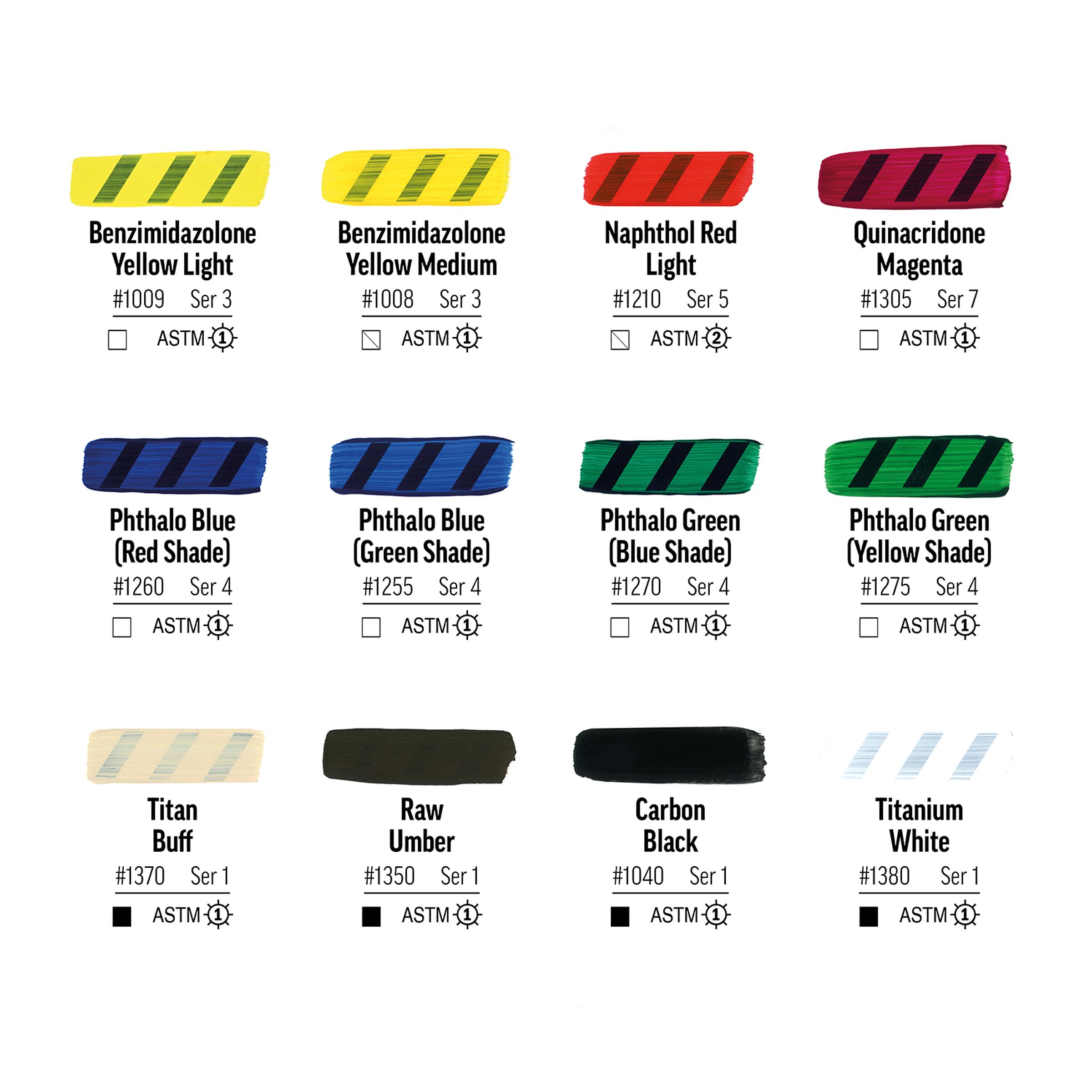 Das Set enthält die Farbtöne Benzimidazolone Yellow Light, Benzimidazolone Yellow Medium, Naphthol Red Light, Quinacridone Magenta, Phthalo Blue (Red Shade), Phthalo Blue (Green Shade), Phthalo Green (Blue Shade), Phthalo Green (Yellow Shade), Raw Umber, Titan Buff, Carbon Black und Titanium White sowie 59 ml Gloss Glazing Liquid.