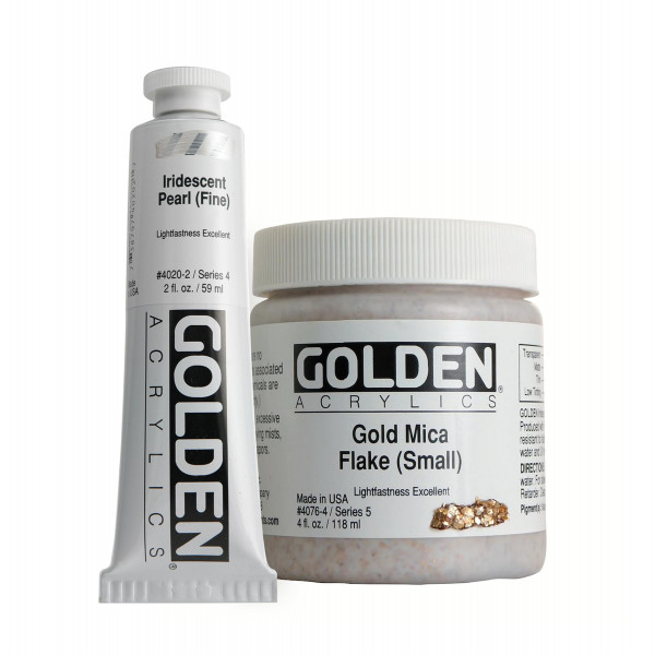 Mit der irisierenden Acrylfarbe lassen sich reflektierende Metalleffekte erzielen. Die Farben sind hoch lichtecht, verblassen nicht und laufen nicht an. Sie lassen sich mit anderen Farben, Gelen oder Medien beliebig mischen und sind mit sehr groben (Mica Flakes), groben (Coarse) und feinen (Fine) Partikeln erhältlich.