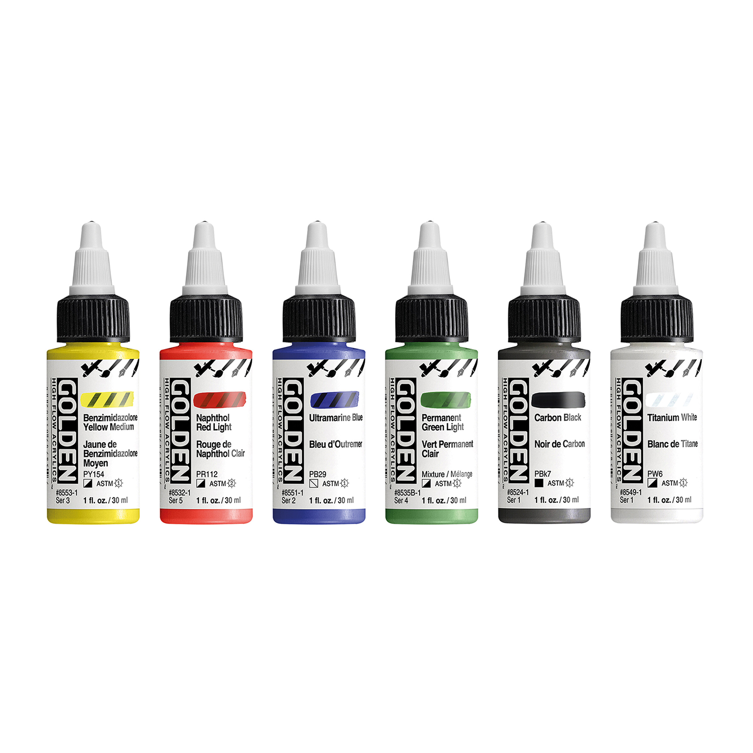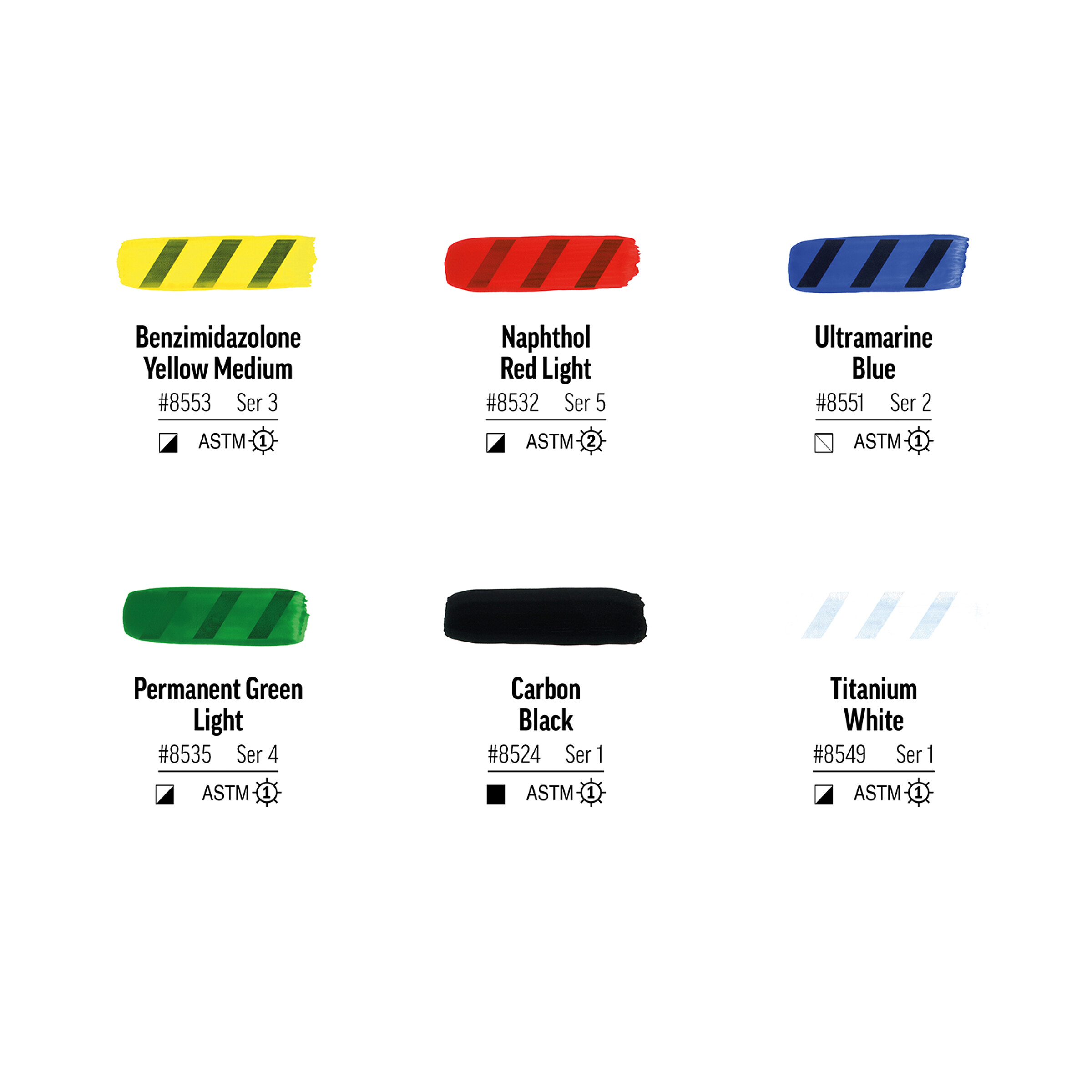 Das Set enthält die Farbtöne Benzimidazolone Yellow Medium, Naphthol Red Light, Ultramarine Blue, Permanent Green Light, Carbon Black und Titanium White.