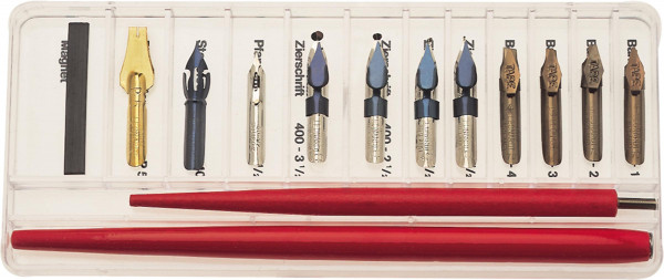Das Set beinhaltet: je 1 Bandzugfeder in 1 / 2 / 3 / 4 mm, je 1 Zierschriftfeder in 0,5 / 1,5 / 2,5 / 3,5 mm, 1 Pfannenfeder 0,5 mm, 1 Stenofeder, 1 Plakatfeder, 1 Magnet, 1 Federhalter mit Röhrchenfeder und 1 Federhalter ohne Feder.