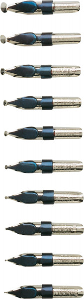 Zierschriftfedern für Gleichzüge in sehr guter Qualität. In 10 Breiten (0,5 / 0,75 / 1 / 1,5 / 2 / 2,5 / 3 / 3,5 / 4 und 5 mm) im praktischen 5er-Pack oder als Set mit allen verfügbaren Breiten erhältlich.
