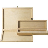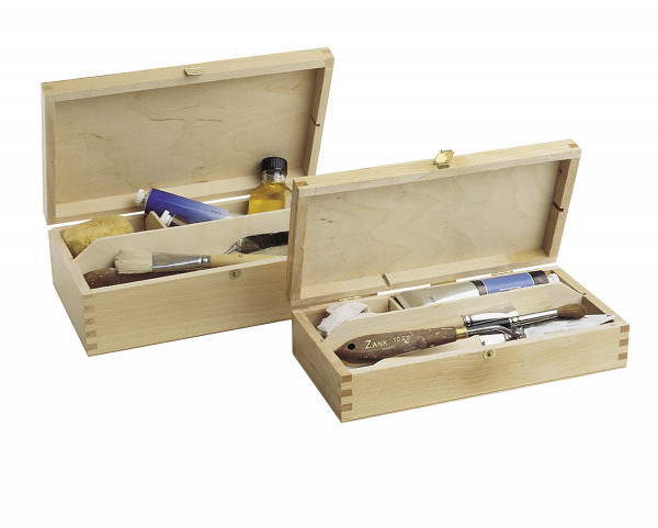 Zur Aufbewahrung verschiedener Künstlermaterialien. Stabil , Korpus aus massiver Buche, Deckel und Boden aus Sperrholz (Birke), sorgfältig gearbeitet, klar lackiert, Leimstellen fachmännisch verzapft, Scharniere und Verschluss aus messingfarbenem Metall. Die Innenaufteilung ist dreifach mit zwei kleineren Fächern und einem größeren Fach. Ohne Inhalt.