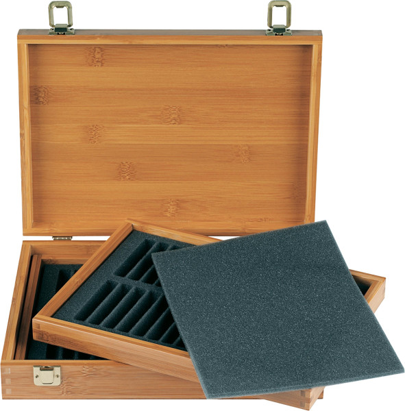 Der Holzkasten fasst 60 ganze Pastelle und bietet Ihnen damit die Möglichkeit, Ihr eigenes Sortiment zu kreieren. Der edle Bambuskasten schützt die Pastelle bei Transport und Lagerung und ist auch als dekoratives Element im Atelier ein echter Hingucker! Inklusive Schaumstoffinlett.
