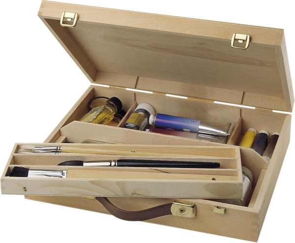 Die Aufteilung des Holzkoffers mit herausnehmbarem Innenteil ermöglicht eine ordentliche Unterbringung verschiedenster Künstlermaterialien. Korpus aus massiver Buche, Deckel und Boden aus Sperrholz (Birke). Stabil gearbeitet, farblos...