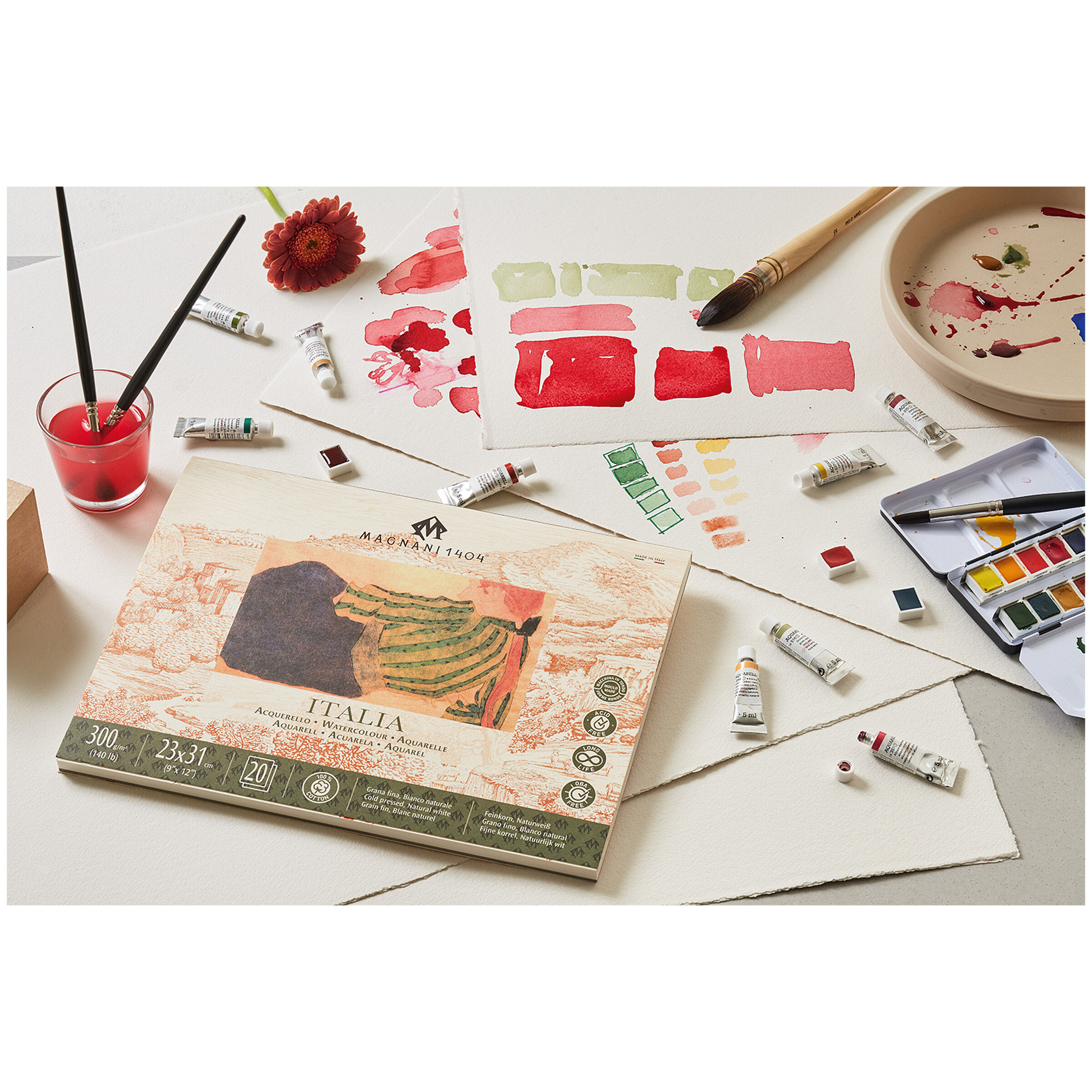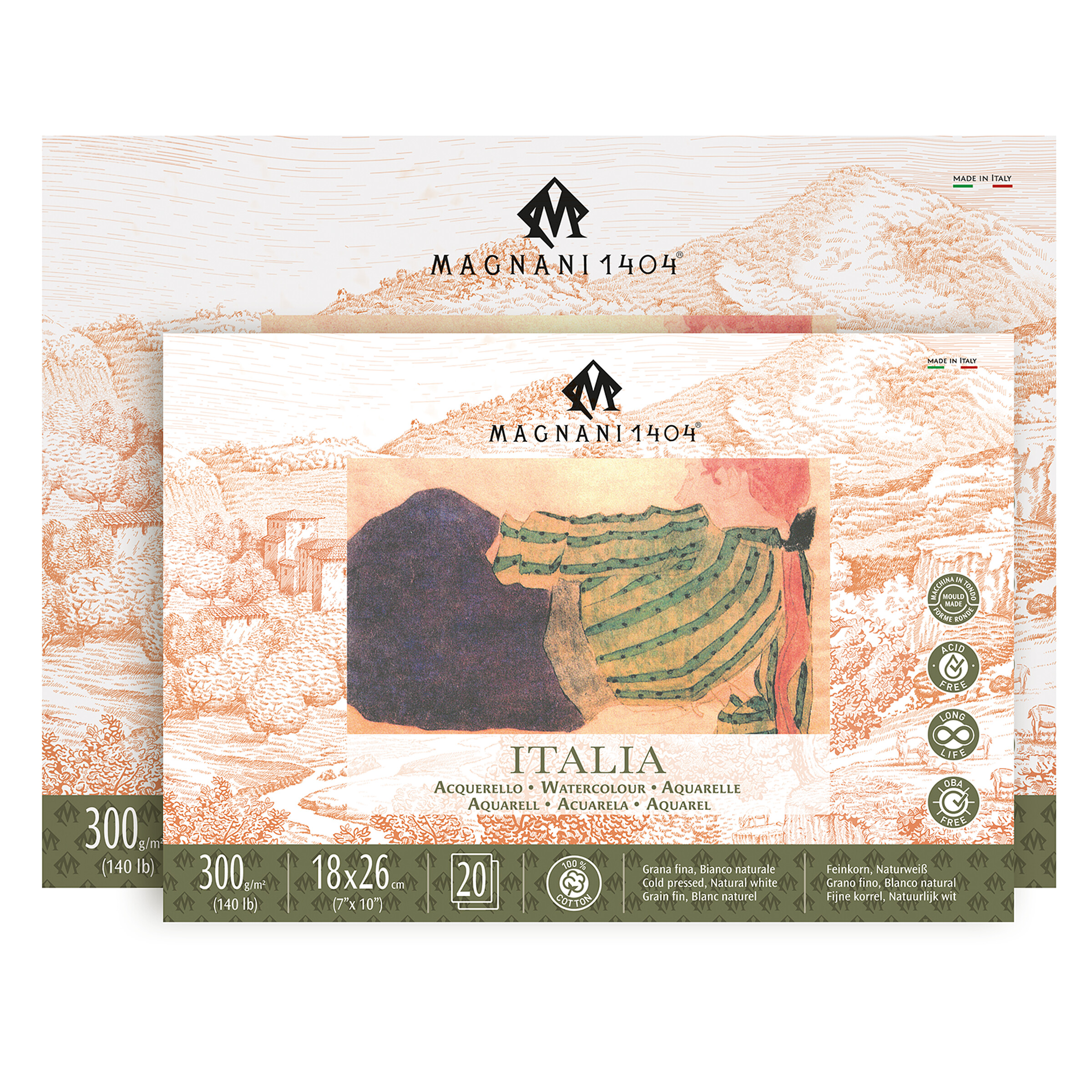 Italia ist ein Aquarellpapier aus 100 % Baumwolle, gefertigt auf einer Rundsiebmaschine. Es ist in 300 g/m² erhältlich und besitzt eine feinkörnige Oberfläche. Das Papier ist naturweiß und eignet sich für alle Nass-Techniken wie...
