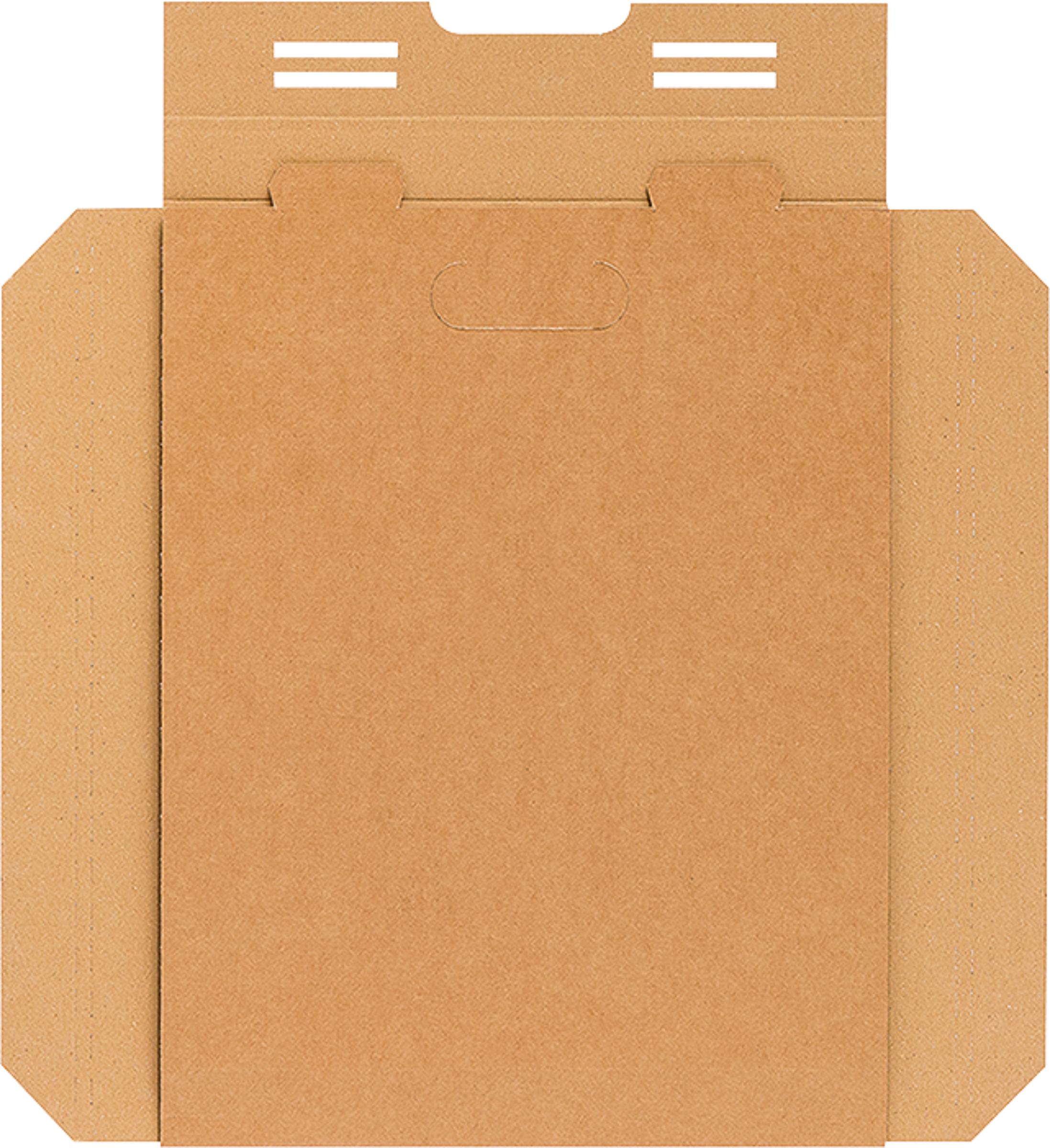 Verpackungskartonage aus fester brauner Wellpappe mit Haltegriff und zwei Verschlusslaschen, geeignet für Transport, Lagerung und Archivierung von Bilderrahmen o. Ä. Die stapelbare Kartonage hat zwei parallele Perforierungen und somit...