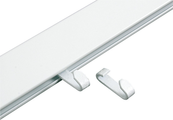 Die Klick-Haken werden einfach von unten in die Bilderschiene eingeklickt. Daran können dann Perlon- oder Stahldrahtseile mit gepressten Ösen eingehängt werden. Nachträgliches Hängen von Bildern an bereits montierten Bilderschienen ist somit besonders einfach. Tragkraft bis ca. 7,5 kg.