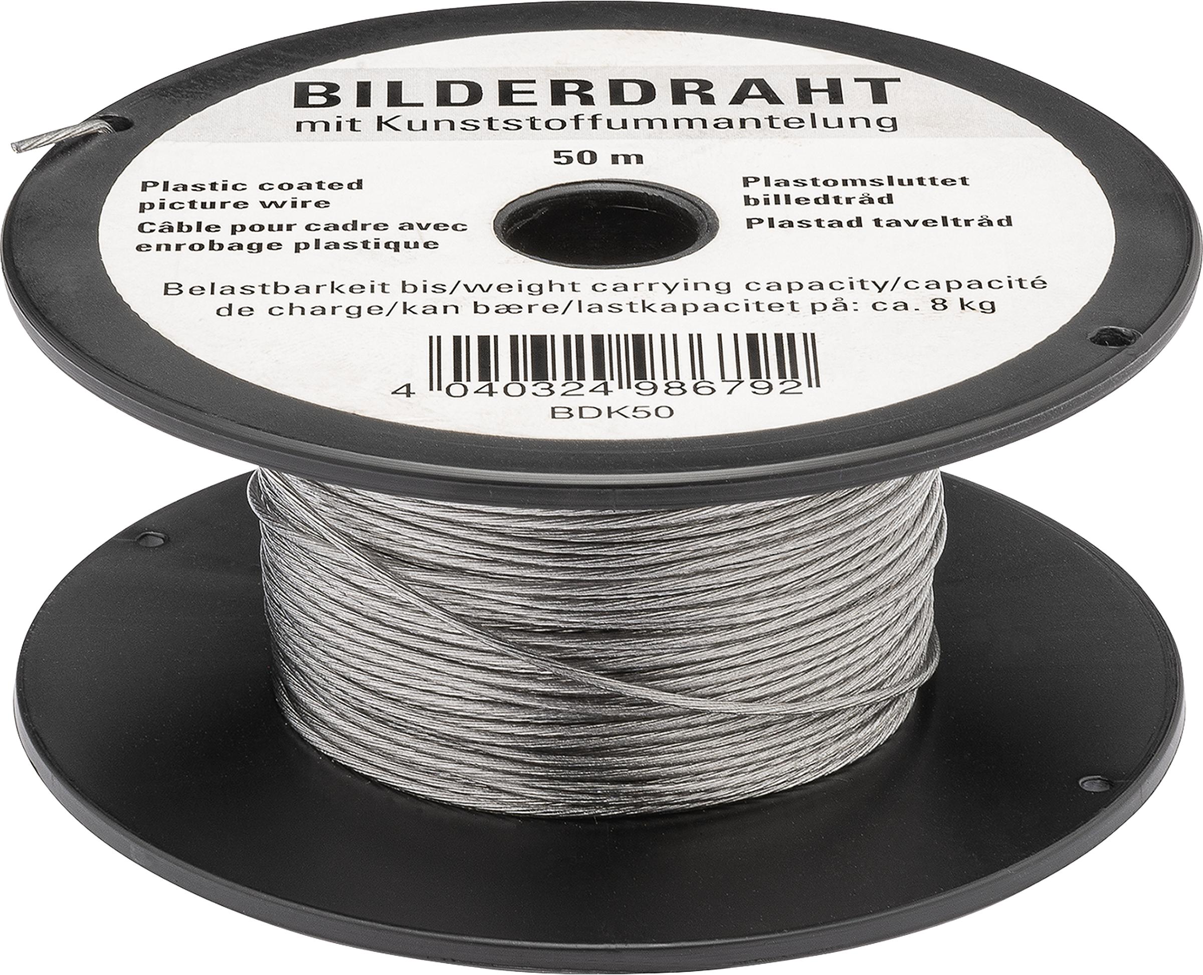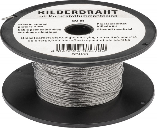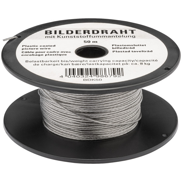 Bilderdraht mit Kunststoffummantelung zum Wickeln und Binden per Hand. Die Kunststoffummantelung verhindert Fingerverletzungen durch die scharfen Drahtenden. Für die Verwendung mit Pressösen nicht geeignet. Belastung bis ca. 8 kg.