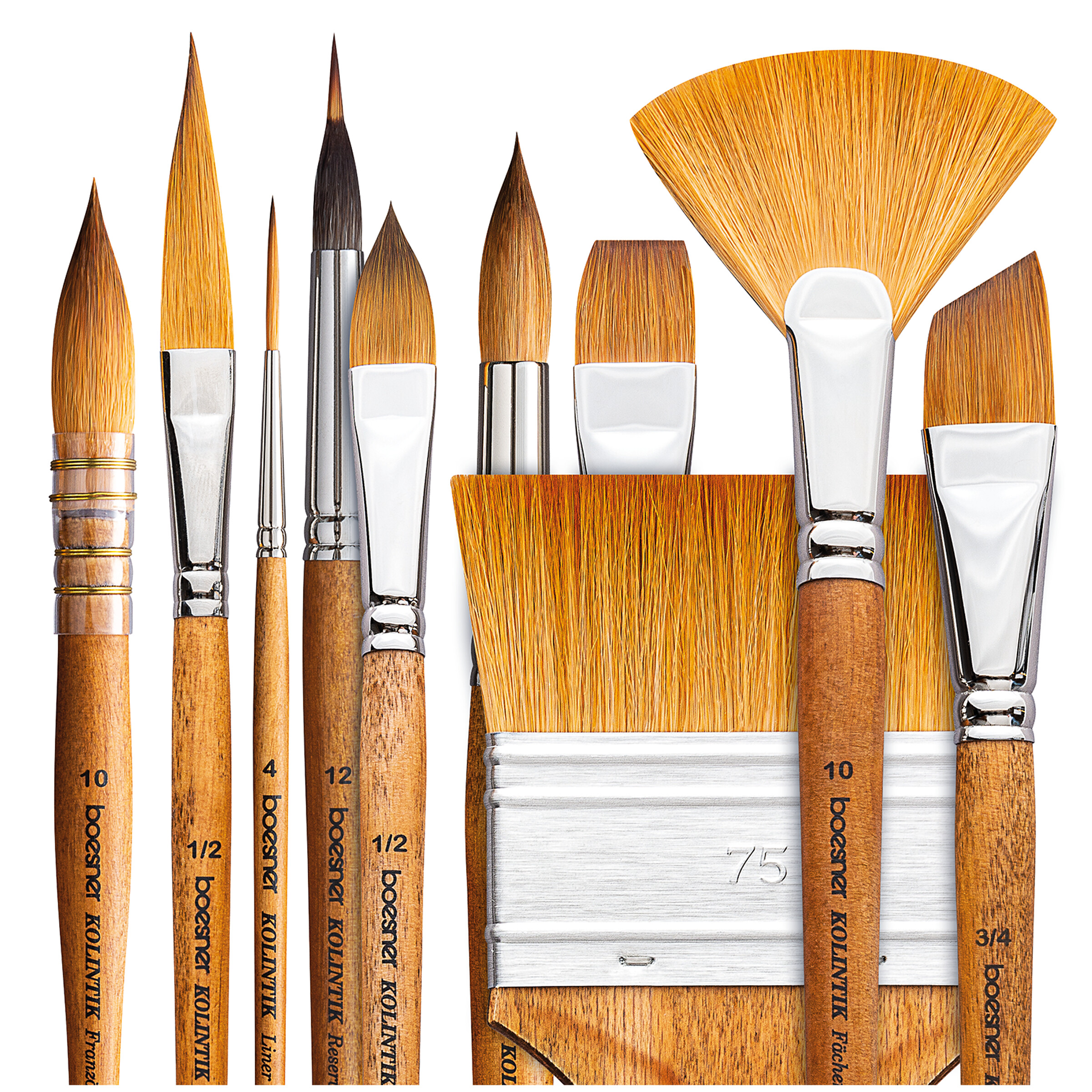 Hochwertige Aquarellpinsel-Serie mit Kolintik-Synthetikhaar. Das Kolintik-Sortiment umfasst neben Aquarellpinseln in runder, breiter und flacher Form auch Mantelschlepper, Verwaschpinsel in Katzenzungenform, französische Verwaschpinsel, Aquarell-Fächerpinsel, Liner und Schwertschlepper. Alle Pinsel mit kurzem Stiel aus FSC-zertifiziertem Birkenholz, mit einer besonders umweltfreundlichen Beize überzogen. Vegan. Handgefertigt in Deutschland.