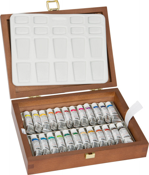 Der Holzkasten enthält die 24 Farben Zitronengelb, Kadmiumgelb hell, Chromgelb dunkel, Chromorangeton, Kadmiumrot hell, Dunkelrot, Permanent Karmin, Magenta, Manganviolett, Ultramarin feinst, Indigo, Preußischblau, Heliocoelin, Heliotürkis, Phthalogrün, Maigrün, Kobaltrgün tief, Permanentgrün oliv, Neapelgelb, Lichter Ocker, Siena gebrannt, Englisch-Venezianisch Rot, Sepiabraun und Elfenbeinschwarz.
