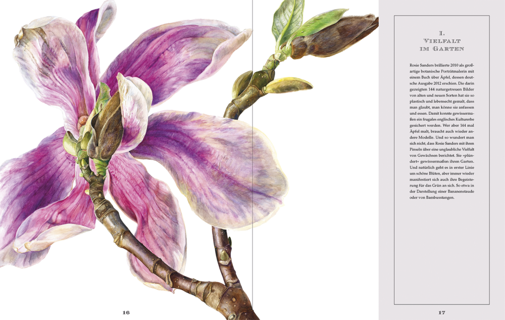 Doch nicht nur die prächtigen Stars des Gartens finden Eingang in ihre Bilder, Rosie Sanders malt auch Wildblumen wie Löwenzahn und Taubnessel, Bambus und Bananenstauden. „Jedes Bild, das ich beginne, verlangt eine neue Sprache“, erklärt die Künstlerin in ihrem Buch „Überwältigende Blüten“. „Jedes Mal fühlt es sich fremd an, als ob dieses das erste Bild wäre, was ich jemals gemalt hätte. Die ersten Schritte sind vorsichtig vorantastend und können extrem schwierig sein, da ich meine gesamte Aufmerksamkeit einem winzigen Detail widme und es außer weißem Papier vor mir nichts gibt, auf das ich mich beziehen kann.“