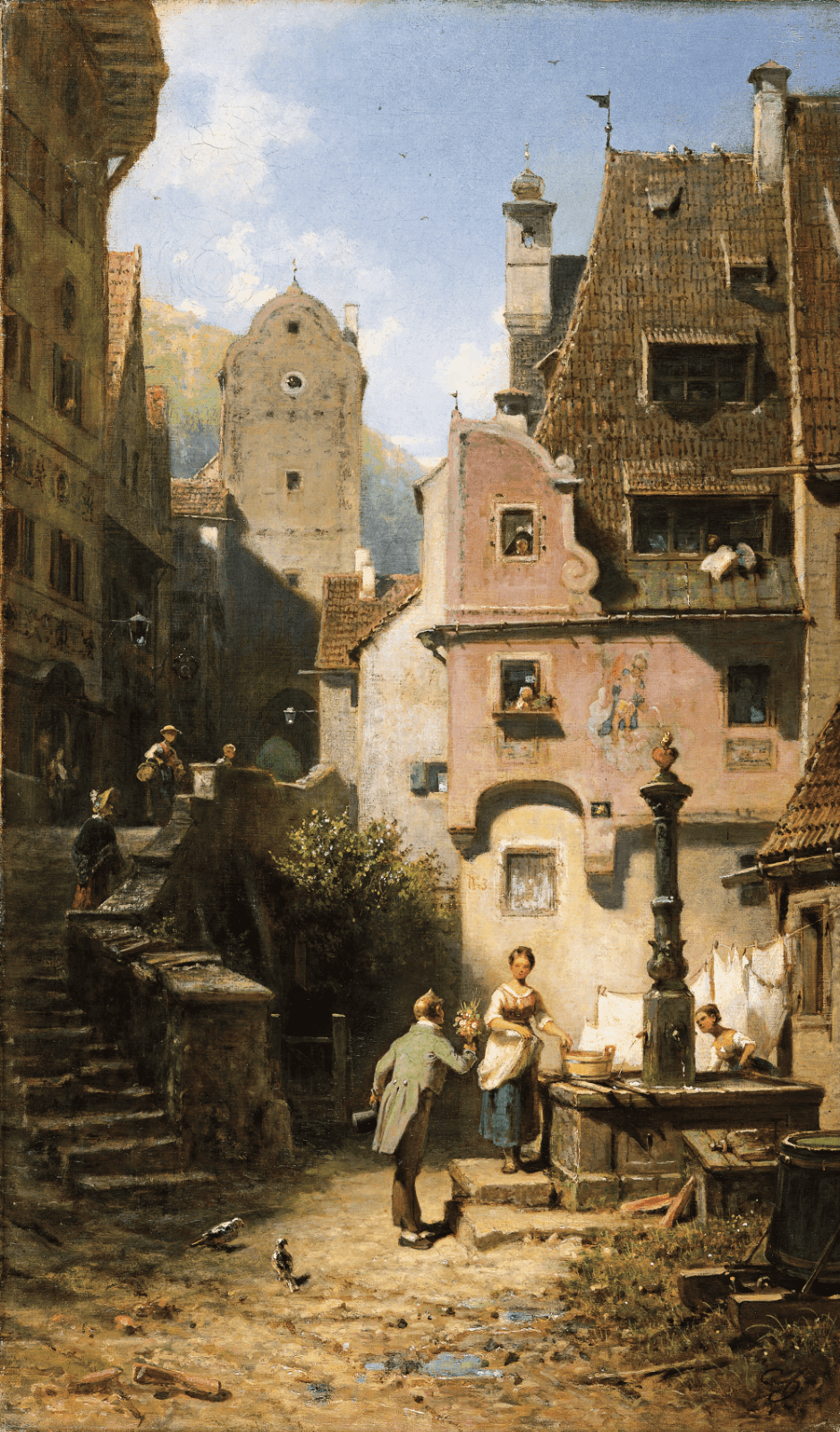 Der Künstler schlägt Bühnen auf: Vom Vordergrund aus, voller Wagenspuren und Pfützen, öffnet sich ein kleiner Platz. Mit ihren schüchternen Voluten verraten die umstehenden Gebäude die Atmosphäre einer deutschen Kleinstadt, eines Residenzstädtchen wohl gar. Der im Hintergrund aufragende Turm ist gewiss der Stolz der ganzen Bürgerschaft. Aber um ihn geht es gar nicht, aller Augen nämlich – und es sind ganz schön viele Augen, denn aus allen Fenstern, Erkern und Gauben hängen die Neugierigen – sind auf die Szene im Mittelgrund gerichtet. Auf der oberen Stufe des das Plätzlein zierenden, steinernen Brunnens steht eine weibliche Gestalt, die den mitgebrachten Eimer abgestellt hat. Will sie Wasser holen oder ist das Gefäß eine Bütte, die zum Geschäft des Wäschewaschens benötigt wird? Das könnte die hinter der Brunnensäule aufgehängte Wäsche andeuten. Aber welche Haushaltsaufgabe auch immer ansteht, die Aufmerksamkeit der Frau mit der weißen Schürze über blauem Rock ist stark abgelenkt. Kein Wunder: Zwei Stufen unter ihr steht ein Mann, nein, offenbar ein Herr, der, in tadellosen Gehrock gekleidet und den Zylinder artig in der Hand, seinem Gegenüber in angedeuteter Verbeugung einen Blumenstrauß zu überreichen sich anschickt. Die Reaktion aber scheint nicht gerade enthusiastische Begeisterung zu sein, nein, eigentlich eher Erstaunen. Ein leises „Huch, was soll denn das?“ vermeint man zu hören. Wir haben wohl richtig geahnt, trägt das Bild doch den Titel Der ewige Hochzeiter: Aus diesem artigen Antrag wird wohl nichts werden, genauso wenig wie aus denen davor und, ach, wohl auch danach …