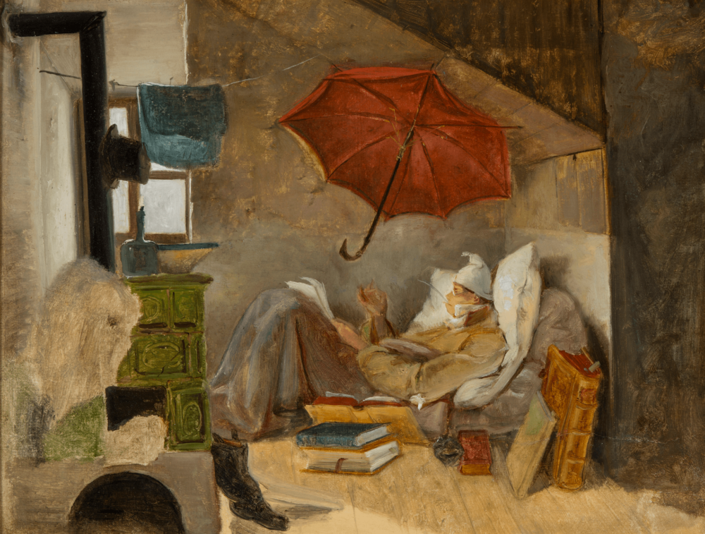 Interessanterweise findet sich auch dort, bei den Malern des 17. Jahrhunderts, die Verwendung unscheinbarer, aber für den Eingeweihten aufschlussreicher symbolträchtiger Accessoires, um Sehnsüchte und Gelüste unterhalb des Radars der gesellschaftlichen Konvention darzustellen. Und so kommt Spitzweg offenbar zu seinen roten Schirmen: Ursprünglich bürgerliches Moderequisit und Zeremonienstab dörflicher Hochzeitslader werden ihm die roten Stoffdächer, aktiv geöffnet oder aber, sozusagen im potenziellen Status verharrend, straff zusammengewickelt, zu Signalen des (vergeblichen) Begehrens. Von 1835 bis 1880 benutzt der vom Theater begeisterte Künstler den roten Schirm in mehr als 60 Gemälden. Prominent figuriert er auch in Spitzwegs wohl berühmtesten Bild, dem metaphorischen Selbstbildnis des Armen Poeten in seiner Dachkammer: Der aufgespannte Schirm schützt den im Bett Liegenden vor dem durchs Dach einsickernden Regen und schafft in seiner emotional gewerteten Farbigkeit einen Raum der Geborgenheit, in dem der Pegasus der Dichtkunst seine Schwingen entfalten kann. Wärme, auch wenn der Ofen kalt bleibt … Dass bei Spitzweg auffällig oft die Objekte männlichen Begehrens bürgerlicher Individuen aus einer unteren sozialen Schicht stammen, Dienstmädchen oder Mägde etwa, scheint auch mit der Biografie des Künstlers zusammenzuhängen, der nach der nicht zustande kommenden Ehe mit einer Handwerkertochter lebenslang ehelos blieb, trotz zahlreicher „Amouren und Amörchen“, wie ein Freund spöttisch meinte.