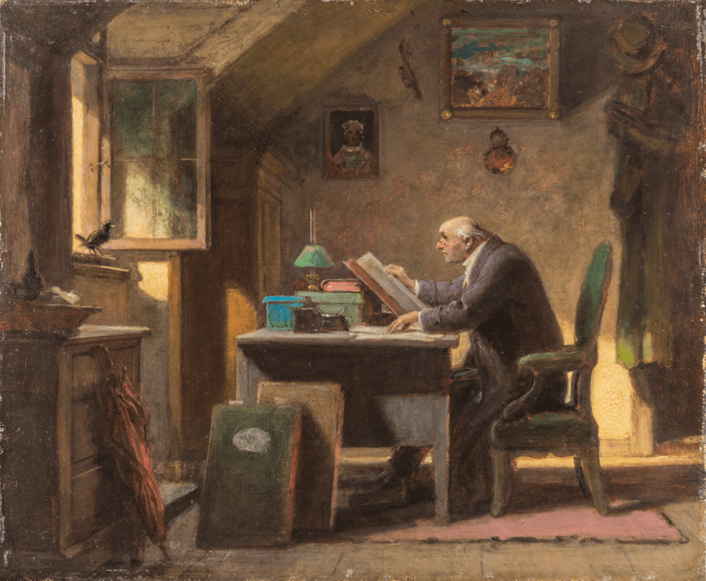 Szenenwechsel: Wir schauen in eine enge Stube hoch oben unter dem Dach, eine bescheidene Behausung. Im Hintergrund sind Hut und Mantel nachlässig auf den Haken geworfen, während der Bewohner, ein älterer Herr, dem nur noch wenige, schüttere weiße Haare verblieben sind, im dunklen Schlafrocke auf einem Lehnstuhl sitzt, der die besten Tage auch schon hinter sich hat. Kurzsichtigen Blickes ist er mit einer mächtigen, auf dem Tische umständlich aufgestützten Scharteke beschäftigt, weitere Folianten warten unten am Tischbein und harren der Entzifferung. Und doch ist der Blick des Studierenden gar nicht in sein Buch gerichtet: Über Brillenrand und Buchkante hinweg schaut er zum links sichtbaren geöffneten Fenster, auf dessen Fensterbank ein kleiner dunkler Vogel sitzt, der seinerseits den Alten unverwandt mustert: Der Besuch.