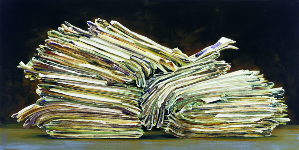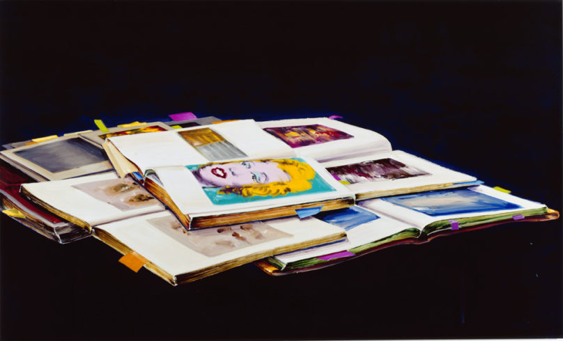 Seine Themen wählt er gezielt. „Nichts ist zu banal oder zu heilig für Völkers künstlerische Neugier und Überprüfung“, schreibt Kuratorin Gail Kirkpatrick im Ausstellungskatalog. „Er plündert die Archive der hohen Kunst wie ein visueller Kidnapper par excellence.“¹ Die Kunstgeschichte ist Cornelius Völker unverzichtbarer Anker und Inspiration zugleich. In Münster ist etwa einer seiner großformatigen Bücherstapel zu sehen – wie seine Werke „Who’s Afraid of Red Yellow and Blue“ und „Hendrickje“ ist auch „Marilyn“ (2014) nicht nur überdimensionale Spiegelung von Realität, sondern gleichermaßen Reflexion über die Kunst. Ein Stapel kunstgeschichtlicher Bücher aus seiner Bibliothek, mit Eselsohren, Lesezeichen und Gebrauchsspuren. Aufgeschlagen ein Band mit Andy Warhols „Marilyn“ –wo endet das Zitat des Originals und wo beginnt der authentische Völker?