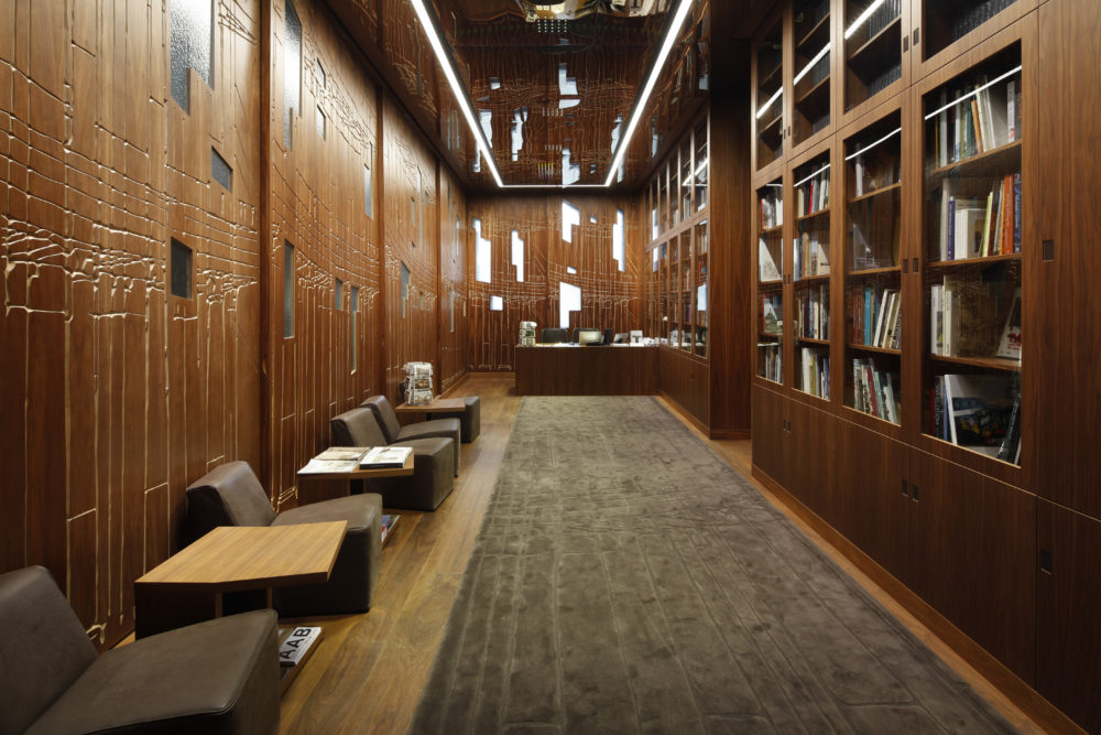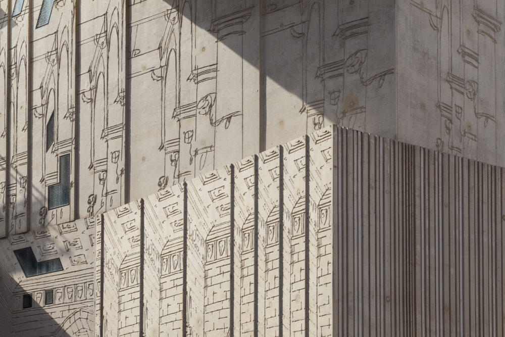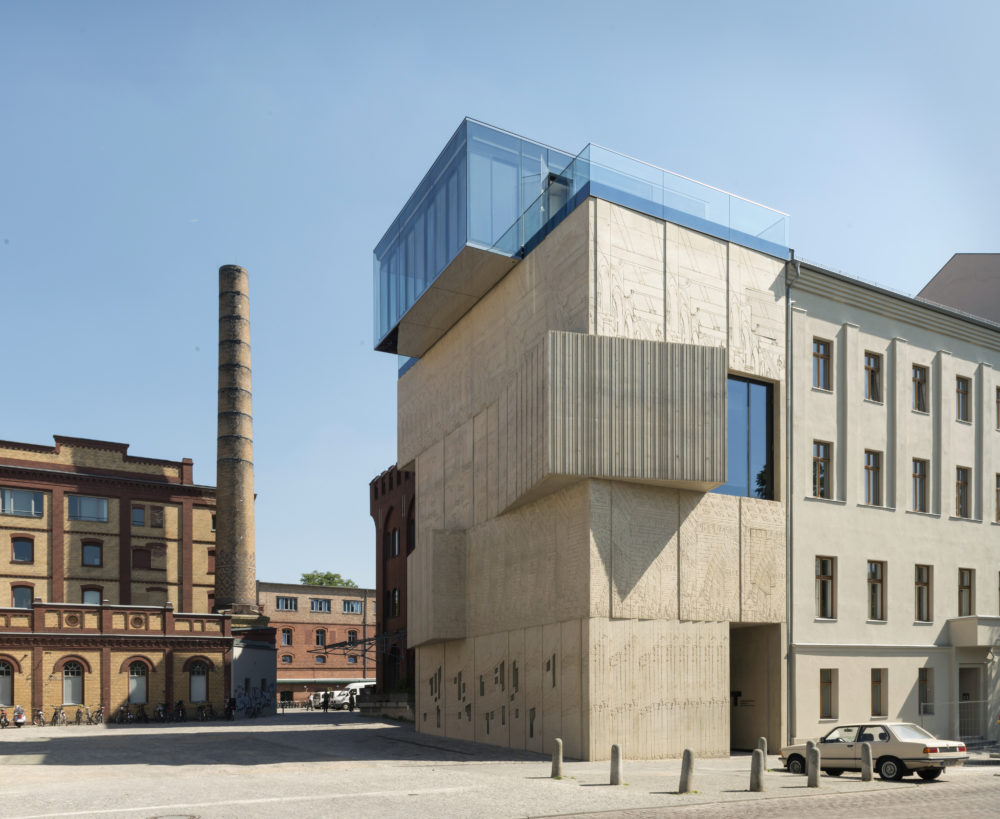 Die 2009 gegründete Tchoban Foundation hat es sich zur Aufgabe gemacht, nicht nur historische Architekturzeichnungen zu sammeln, sondern auch diese große Tradition im Zeitalter des Computers lebendig zu erhalten. Werke aus der Sammlung gehen an renommierte Institutionen weltweit als Leihgaben, vor allem aber werden wechselnde Ausstellungen im eigenen Haus veranstaltet. Dieses konnte 2013 als Museum für Architekturzeichnung eröffnet werden im Berliner Stadtteil Prenzlauer Berg. Das ehemalige Industrieareal – die Brauerei Pfefferberg hatte hier ihr Quartier – wird heute überwiegend kulturell genutzt von Galerien, Künstlerateliers und ähnlichen Einrichtungen. Aus dem unter Denkmalschutz stehenden Gebäudebestand sticht das Museum für Architekturzeichnung heraus, ein kompakter fünfgeschossiger Stapel aus leicht gegeneinander verschobenen Boxen. Deren oberste kragt zur Seite deutlich aus und ist als einzige verglast. Die geschlossenen Wände der unteren Etagen sind erstellt im Sichtbetonguss. Aber was für ein Guss! Denn anstatt der schnöden Spuren gewöhnlicher Schalung findet sich auf den Außenflächen ein vertieftes Relief: die stark vergrößerten Ausschnitte architektonischer Zeichnungen! Die überdimensionierten Linien sind elegant-lebendiger Flächendekor, verweisen vor allem aber auf den Inhalt des Gebäudes, das Archiv und die Ausstellungsräume. Innen dominiert warmes Nussbaumholz, eine Atmosphäre, die der konzentrierten Betrachtung der ausgestellten Werke förderlich ist. Diese verwenden zumeist Papier als Bildträger. Schon das Logo von Haus und Stiftung erzählt von der liebevollen Hingabe ans Thema Architekturzeichnung: Ein großes „T“ umreißt ein korinthisches Kapitell, wie aus einer Zeichnung herauspräpariert!