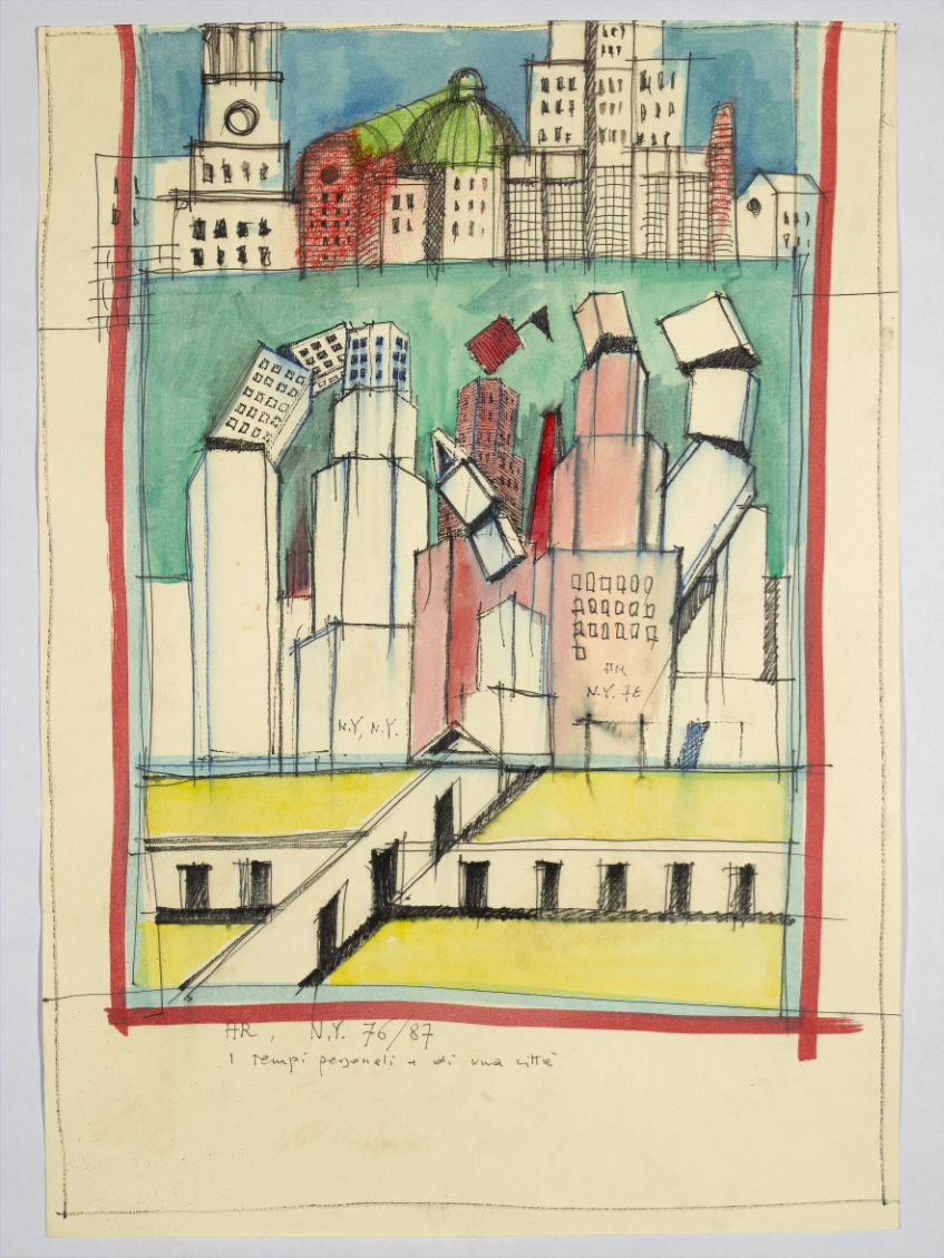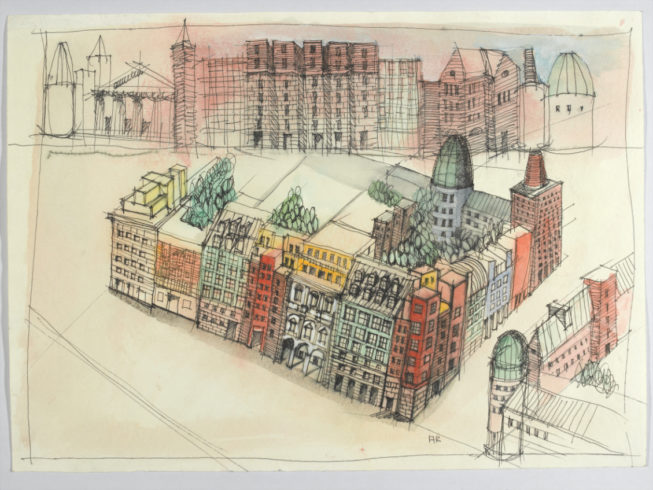 Bekannt und doch nicht bekannt: Das Quartier Schützenstraße (Ecke Friedrichstraße) gehörte zu den prägnantesten und damals auch umstrittensten Bauten des neuen Berlin der Nachwendezeit. Der italienische Architekt Aldo Rossi hatte für seine Blockbebauung (1994–1997) mit ihrer gemischten Nutzung von Wohn-, Büro- und Ladenflächen eine Formsprache eingesetzt, die der Moderne verpflichtet war und sich gleichzeitig mit einem visuell starken Statement auf die Geschichte der Baukunst bezog: Ein Durchgang zum Innenhof zitierte ganz ungeniert Michelangelos Fassadengliederung am römischen Palazzo Farnese. Die Aufregung hat sich mittlerweile gelegt, Rossis Bau ist zum Berliner Alltag geworden. Umso spannender aber, dass die Tchoban Foundation in ihrem Museum für Architekturzeichnung nun einen eher unbekannten Rossi präsentieren kann: „Aldo Rossi. Insulae“ versammelt gut 110 grafische Werke und vor allem Zeichnungen des italienischen Architekten, die zumeist erstmalig öffentlich präsentiert werden.