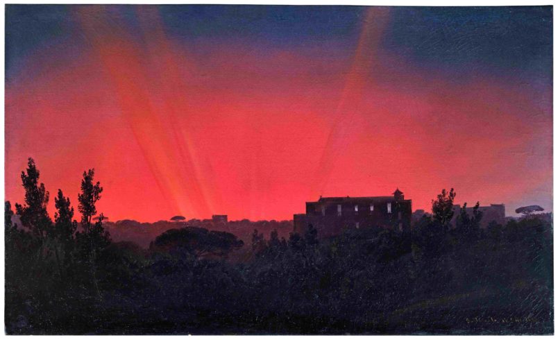Im ausgehenden 18. und frühen 19. Jahrhundert war Italien, seit der Renaissance in den kulturellen Blickpunkt gerückt, für die meisten Künstler nach wie vor das Nonplusultra. Demzufolge auch das Mutterland der Ölstudie – davon handelt der Abschnitt „Im Land des Lichts: Die italienische Erleuchtung“. Zugleich gab es hierzulande immer mehr Landschaftsmaler, die sich vom und vor Ort ein Bild machen wollten. Die zweite Sektion „Draußen vor der Tür: Heimaterkundung in Öl“ schildert, wie die Künstler das vermeintlich Vertraute auf ihren Streifzügen neu entdeckten – und mit zuvor unüblicher Eindringlichkeit festhielten: Johann Georg von Dillis erkundete die Parks und das Umland Münchens. Carl Blechen wurde in Berlin und Brandenburg fündig. Und die Schüler der Düsseldorfer Kunstakademie – um 1830 Vorreiter, was den Einsatz der Ölstudie in der Lehre angeht – sondierten die ländliche Umgebung entlang des Rheins bis ins Bergische Land. Welche Ausrüstung sie dabei benötigten, davon vermittelt eine Vitrine in der Ausstellung einen Eindruck: Neben Farben und Malkasten führten sie eine Sitzgelegenheit und einen Sonnenschirm mit sich; manche nahmen sogar eine kleine Staffelei mit.