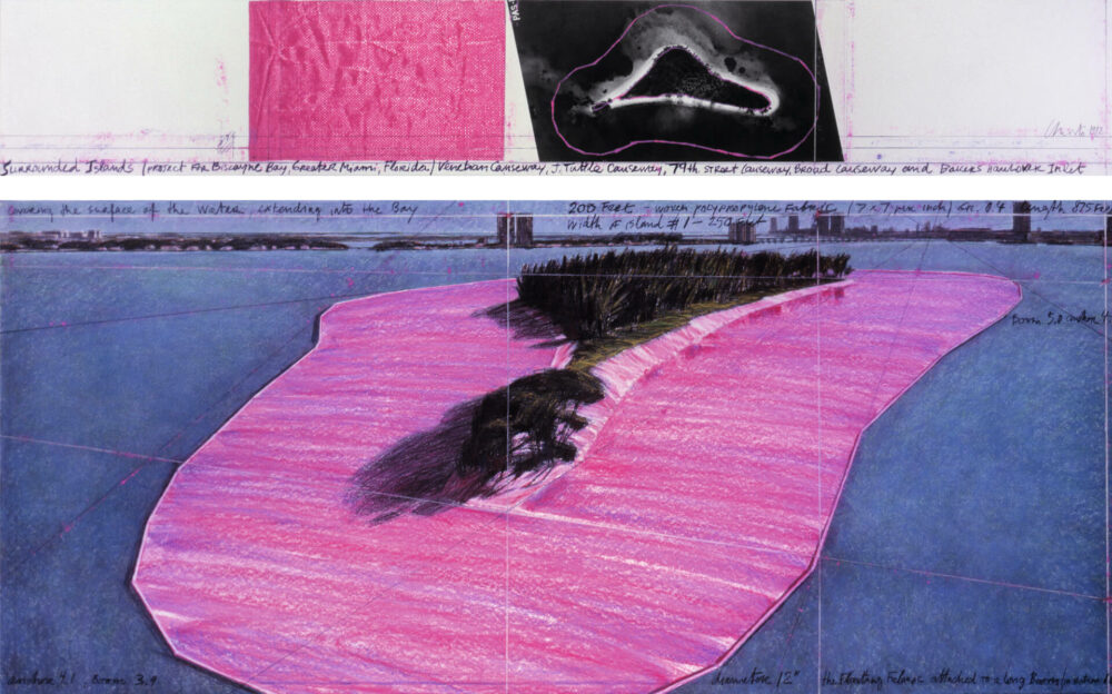 Verbindendes Element vieler Projekte ist dabei das Medium Stoff, der sich mal als Außenhülle um Gebäude, Felsen oder Bäume schmiegt, mal als pinke Umrandung ganzer Inseln vor Miami dient oder leuchtend gelb die schwimmenden Plattformen im Lago d’Iseo akzentuiert. Aber auch gestapelte Ölfässer ziehen sich wie ein roter Faden durch das gesamte Werk des Künstler-Duos.