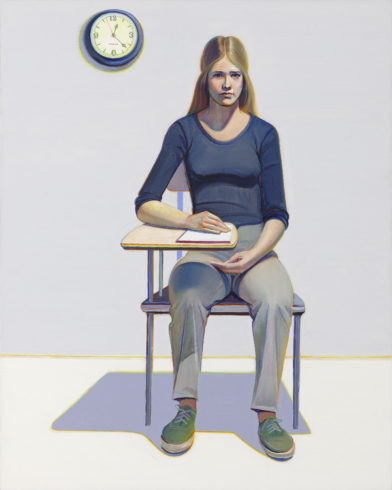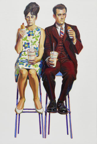 In einem weiteren Raum sind Spielautomaten das Hauptmotiv. Jackpot (2004) präsentiert einen sogenannten „Einarmigen Banditen“, der für kleines Geld die Chance auf den Hauptgewinn verheißt. Ähnlich wie die Kuchen lockt auch dieses Stillleben mit heimlichen Glücksgefühlen. Daneben gewähren spiegelnde Farbtöpfe mit herabtropfender Farbe und bunte Pastellkreiden, die den Abschluss des Themenkreises „Stilleben“ markieren, einen fast intimen Einblick in ein weiteres Sujet: den Arbeitsalltag des Künstlers und seine Malutensilien. In Thiebauds Figurenbildern bleibt die Nähe zu seinen Stillleben weiterhin sichtbar, die Personen wirken zwar realistisch erfasst, posieren aber in ungewöhnlichen, statischen Körperhaltungen – in der Badewanne bis zum Kopf versunken, in Badeanzügen neben einander kniend oder Eiscreme essend. Girl with Pink Hat (1973) orientiert sich an prominenten Bildnissen der Renaissance etwa eines Sandro Botticelli oder eines Giorgione. Doch im Unterschied zu diesen lassen Komplementärkontraste und leuchtend farbige Konturen das „Mädchen mit dem pinken Hut“ erstrahlen. Eating Figures (1963) dagegen ist jene Komik unterlegt, die man in vielen von Thiebauds Bildern vorfindet: Ein Mann im Anzug und eine Frau im Kleid sitzen auf Barhockern sehr eng nebeneinander und blicken scheinbar lustlos auf ihre Hotdogs, die sie in den Händen halten. Der Heißhunger auf Fast Food und der Genuss des beliebten Imbisses wird hier mit den Mitteln der Ironie ad absurdum geführt.