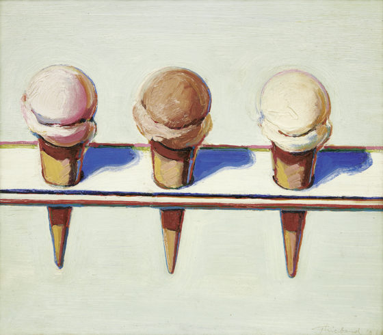 Ein ganzer Raum der Ausstellung ist der wohl bekanntesten Werkgruppe, den Stillleben, gewidmet. In allerlei Auslagen und auf Tellern hübsch präsentiert, reihen sich süße Leckereien aneinander. Spielzeuge, Stofftiere und Eiscreme-Waffeln erinnern an die größten Versuchungen aus Kindertagen. Pie Rows (1961) zeigt verschiedene solcher Kuchenstücke, die sich neben- und hintereinander zu einem Muster fügen. In ihrer süßen Verführungsmacht haben sie eine ebenso beruhigende wie überwältigende Wirkung auf die Betrachtenden. Thiebaud gelingt es so, die vermeintliche Harmlosigkeit der verbildlichten Lebensmittel und Gegenstände zu entlarven und diese in ihrer Verfügbarkeit als bedeutende Elemente von Konsumverhalten kenntlich zu machen. Über seine Kuchenbilder war Thiebaud offenbar letztlich selbst mitunter erstaunt. Er erinnerte sich daran mit seinem ganz eigenen Humor: „‘Mal sehen, ich habe in vielen Restaurants gearbeitet und habe reihenweise Kuchen und anderes gesehen.‘ Mit diesen Ovalen und Dreiecken habe ich also ganz elementare Kuchen produziert. Am Anfang bin ich es ganz schlicht angegangen, und ich habe nicht erkannt, was ich da getan hatte … Es war diese Reihe an Kuchenbildern entstanden und ich war selbst verblüfft. Ich habe mir buchstäblich gedacht, ‚Das wäre das Ende für einen seriösen Maler.“