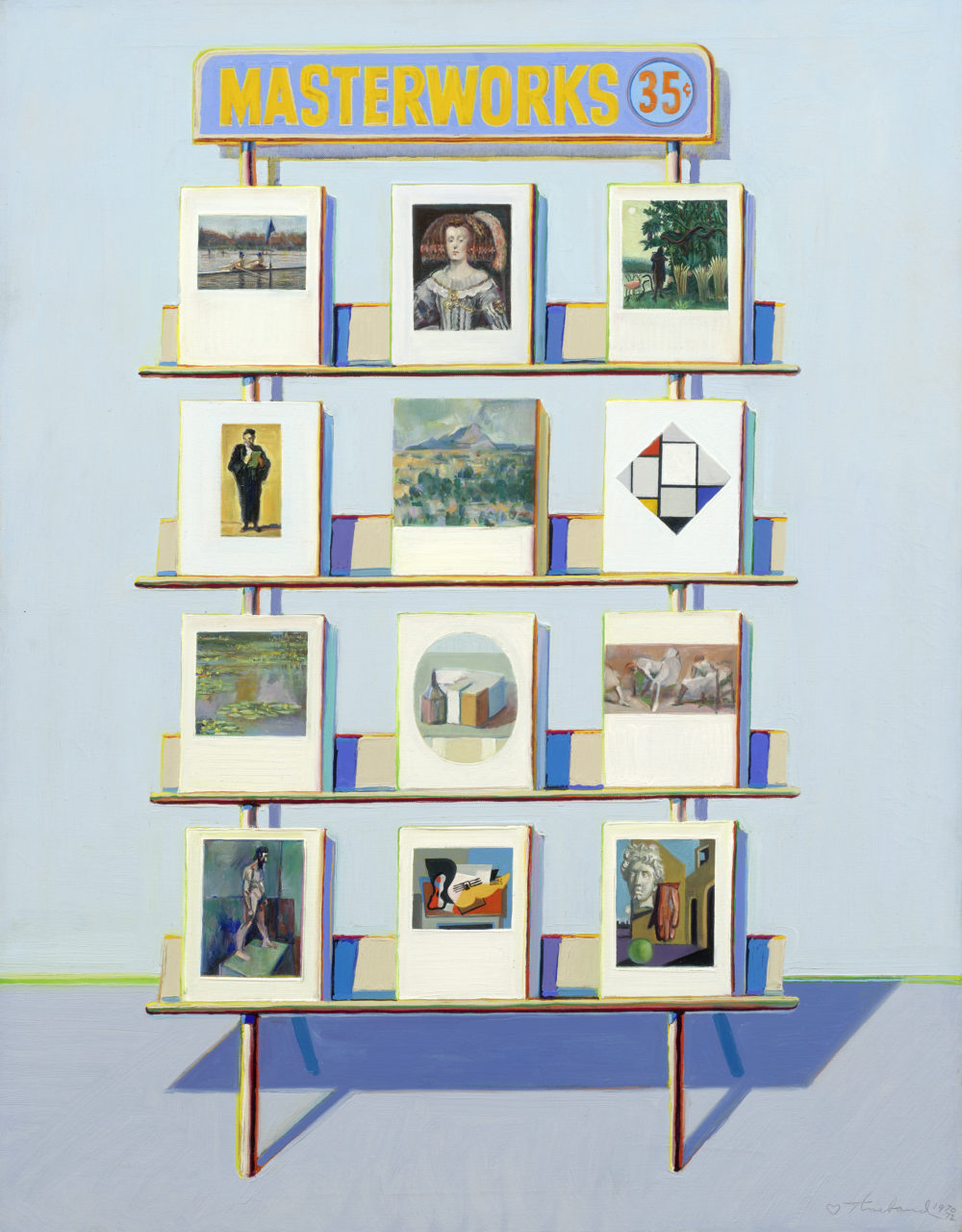 Die Ausstellung präsentiert in einzelnen Themen gewidmeten Räumen Thiebauds wichtigste Werkgruppen. Dazu gehören seine Stillleben, Figurenbilder, Stadtansichten und Flusslandschaften. Den Auftakt bilden drei seiner Schlüsselwerke: Student (1968), 35 Cent Masterworks (1970) und Mickey Mouse (1988), die seine Verbundenheit mit der frühen amerikanischen Popkultur zeigt. Die Comicfigur Mickey Mouse ist gewissermaßen der Gegenentwurf zum traditionellen westlichen Kanon der Kunst und verkörpert gleichsam die Quintessenz des „Pop“. Mit Student wiederum führte Wayne Thiebaud die Prinzipien der Porträtmalerei exemplarisch vor Augen: Zu sehen ist eine junge Frau, die den Betrachtenden auf einem Stuhl gegenübersitzt und diese intensiv anzuschauen scheint. Trotz ihres fixierenden Blicks verschwimmt ihre Individualität bei genauerem Hinsehen, die Wirkung der Farben überlagert die Wahrnehmung ihrer Person. Dieser distanzierte Eindruck verstärkt sich, je mehr man sich dem Bild nähert: Jegliche individuellen Züge der jungen Frau scheinen sich in Myriaden von Kombinationen strahlender Farben aufzulösen. Um Persönlichkeiten anderer Art geht es in 35 Cent Masterworks, in dem Thiebaud seine künstlerischen Vorbilder versammelt hat. Fein säuberlich arrangiert stehen dort zwölf bedeutende Werke der Kunstgeschichte in einem Zeitschriftenregal. Mondrians Tableau No. IV, Monets Seerosen und Picassos Nature morte à la guitare sind wie alle anderen Bilder für nur 35 Cent erhältlich, wie ein Preisschild verrät. Thiebaud, ein Kenner der Kunstgeschichte, hinterfragt in seinem Gemälde den „Wert“ der Meisterwerke, die er eigentlich bewundert, auf humorvolle Art, und thematisiert zugleich das Verhältnis von Original und Reproduktion.