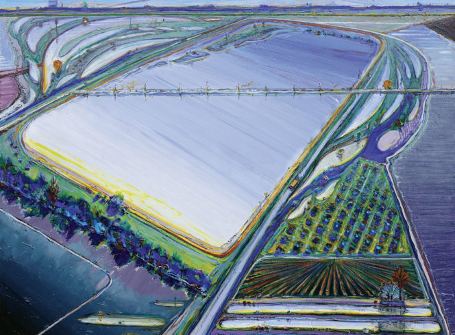 Weniger bekannt sind Thiebauds Bilder von Städten und Landschaften. Rock Ridge (1962) und Canyon Mountains (2011/12) zeigen steile Felswände, die von Hochplateaus abfallen, auf denen sich zuweilen detailliert gemalte Landschaften erstrecken. In den 1960er-Jahren begann Wayne Thiebaud erste Landschaftsbilder zu malen. Dabei konzentrierte er sich auf atemberaubende Darstellungen von San Francisco, abgeflachte Vogelperspektiven auf das Flussdelta des Sacramento River und wuchtige Panoramen der Berge und Gebirgsketten der Sierra Nevada. Die gemalten Abgründe vermitteln den Eindruck, als ob man in die Abgründe der Farben stürze. Für seine Stadtansichten liess sich Thiebaud maßgeblich von San Francisco inspirieren. Die Stadt mit ihren achterbahnartigen Steigungen und steilen Straßen hat er auf fantasievolle Weise mittels starker Kontraste und von Diagonalen beherrschter Kompositionen verbildlicht. Schwindelerregend sind die Straßenzüge in die Höhe gekippt, sie versetzen die Betrachtenden in atemloses Staunen und regen dazu an, darüber nachzusinnen, ob sie überhaupt begeh- oder befahrbar sind. Es sind symbolhafte Bilder der zeitgenössischen US-amerikanischen Stadtlandschaft, die von einem dicht ausgebauten Straßennetz und von Ballungszentren geprägt ist und wo selbst noch die unwirtlichste Natur vom Menschen technisch erschlossen wird und trotzdem seltsam entleert wirkt. Die später entstandenen Gemälde Ponds and Streams (2001), Flood Waters (2006/2013) oder auch White Riverscape (2008–2010) wiederum zeigen künstliche Seen und Flusslandschaften. Ab den 1990er-Jahren ließ sich Wayne Thiebaud von landwirtschaftlich intensiv genutzten Flächen in der Nähe seines Wohnorts Sacramento zu einer Reihe von panoramaartigen Motiven inspirieren. Ponds and Streams präsentiert eine typische nordkalifornische Kulturlandschaft, fernab der touristisch bekannteren Gegenden. Die Felder, Baumgruppen und Wasserreservoirs geben die Topografie nicht exakt wieder. Sie fügen sich vielmehr zu einer bruchstückhaften, sich aus zahlreichen Erinnerungen speisenden Komposition, die durch die Verwendung der Pastellfarben verfremdet erscheint.