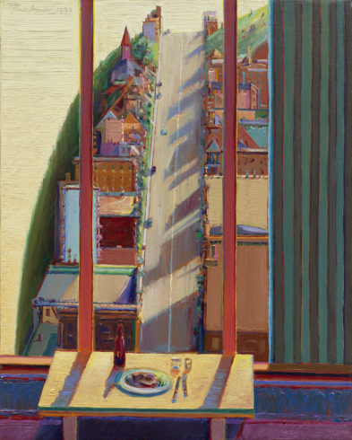 Wayne Thiebaud wurde am 15. November 1920 in Mesa, Arizona, geboren und wuchs hauptsächlich im kalifornischen Long Beach auf. Seine Vorfahren gehörten zu den ersten Siedlern mormonischen Glaubens, die sich in der Mitte des 19. Jahrhunderts in Utah niederließen. Zu Zeiten der Wirtschaftskrise zog Thiebaud mit seiner Familie vorübergehend zurück nach Utah, wo sie Landwirtschaft betrieb. Ab 1935 besuchte er die Highschool, auf der er schon seine Mitschüler*innen und Lehrer*innen karikierte. Früh entdeckte er sein Interesse für Comics und Zeichentrickfilme, im Sommer 1936 arbeitete er kurzzeitig in der Trickfilmabteilung der Walt Disney Studios – dort lernte er unter anderem, Mickey Mouse zu zeichnen. Während seines Diensts beim Militär gestaltete er die Comicserie Aleck für das Mitteilungsblatt seines Stützpunkts und entwarf Poster und Wandbilder. Diese Zeit markiert den Beginn seiner Karriere als Maler. Von 1949 bis 1953 studierte Thiebaud Kunst an der San José State University und der California State University in Sacramento. Dort spielte er auch Tennis, eine Leidenschaft, die ihn sein Leben lang begleiten sollte. Noch während des Studiums wurden seine Werke 1951 in einer Einzelausstellung in der Crocker Art Gallery in Sacramento gezeigt, im gleichen Jahr nahm er einen Lehrauftrag am Sacramento City College an. Bei einem Aufenthalt in New York in den 1950er-Jahren lernte er Willem und Elaine de Kooning kennen; 1962 stellte Thiebaud erstmals seine Werke in der renommierten New Yorker Allan Stone Gallery aus. Zehn Jahre später zeigte Harald Szeemann seine Arbeiten auf der wegweisenden Documenta 5 in Kassel. Auch als Professor für Malerei genoss Thiebaud einen ausgezeichneten Ruf. Er bildete Generationen von Künstlern und Künstlerinnen aus, darunter Bruce Nauman, der zeitweise sein Assistent war. 1978 präsentierte das San Francisco Museum of Modern Art die Ausstellung „Wayne Thiebaud: Recent Work“. Das Whitney Museum in New York widmete Thiebaud 2001 eine Retrospektive.
