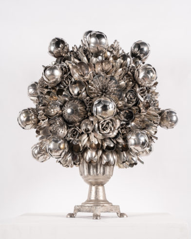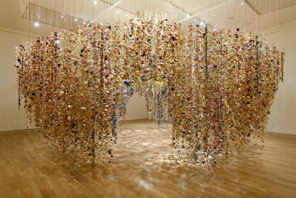 Kunst und Naturwissenschaft haben sich bei der Darstellung von Blumen stets gegenseitig inspiriert. So wurden Forschungsergebnisse in der Naturwissenschaft mit ebenso kunstvollen wie präzisen Illustrationen versehen. Die Beschäftigung mit den mannigfaltigen Erscheinungsformen von Blüten aus aller Welt regten wiederum Künstler*innen zu floralen Kreationen an, die weit über die rein botanisch korrekte Darstellung hinausgingen. Dabei reflektieren sie das Verhältnis von Kunst, Natur und Wissenschaft und feiern zugleich die Pracht und Vielfalt der Farben und Formen der Blumen. Mit der Tulpenmanie in den Niederlanden wurde der Handel mit Blumen im 17. Jahrhundert erstmals zum großen Spekulationsgeschäft, wovon überaus kunstfertige Möbel und Vasen, aber auch satirische Gemälde zeugen. Heute sind sowohl die Blumenzucht als auch der Handel längst global organisiert, was Künstler*innen zur Beschäftigung mit ökologischen und sozialen Fragen veranlasst. Sie konfrontieren uns mit unserem Konsumverhalten und thematisieren die Auswirkungen des menschlichen Handelns auf die Umwelt. So auch die als Gemeinschaftsprojekt entstandene Installation Calyx (Blütenkelch) der britischen Künstlerin Rebecca Louise Law (*1980), die mit 200.000 getrockneten Blumen das große Finale des Parcours bildet. Schon ein knappes Jahr im Vorfeld hatte die Kunsthalle Münchnerinnen und Münchner aufgerufen, für das Projekt der Britin Blüten zu sammeln und zu trocknen – und die Resonanz war überwältigend. Schließlich halfen auch viele Hände, die Blumen zu sortieren und zu verdrahten, sodass das Kunstwerk auch in gewissem Sinne ein Gemeinschaftsprojekt der Stadt und ihrer Bürger*innen ist.