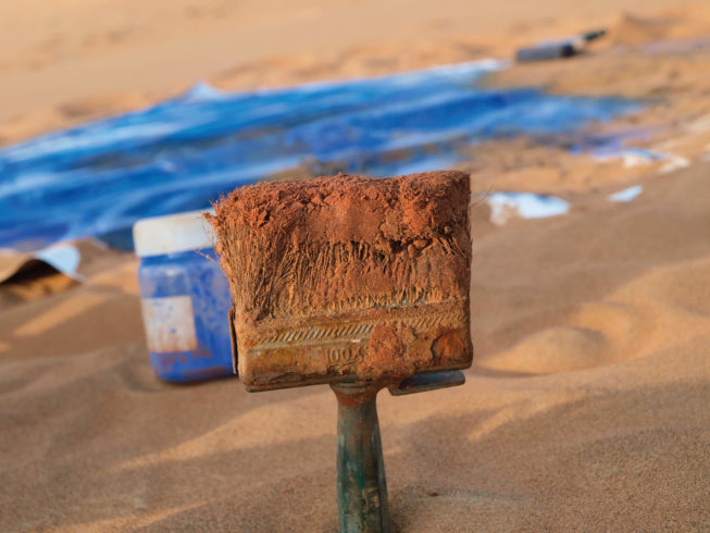 Wenn er nach Wochen in die Hansestadt zurückkehrt, hat der Künstler nicht nur bemalte Leinwände im Gepäck: „In der Wüste habe ich meinen Akku wieder aufgeladen.“ Im heimatlichen Atelier bekommen seine bis zu 2 x 2 m großen Leinwände dann ihren letzten Schliff. Die schweren Malgründe werden auf stabile Keilrahmen gespannt und es fließt noch die ein oder andere Farbschicht. Denn „natürlich leiden die Bilder in der Wüste gemeinsam mit mir unter der unbarmherzigen Sonneneinstrahlung, in Sandstürmen und in den teils eisigen Nächten. Auch beim Transport geht einiges an Material verloren, das sich aber in den Köchern ansammelt. Außerdem kann ich Farbeindrücke, die ich aufgrund fehlender Pigmente in der Wüste nicht realisieren konnte, nach der Reise im Atelier aufbringen.“ Abschließend erhalten die Bilder die Firnisschicht. Sind die letzten Handgriffe erledigt, spürt Carsten Westphal auch bald schon wieder die Sehnsucht in sich aufkeimen, die nächste Wüste zu besuchen. Seine Lieblingswüste ist die Sahara. Irgendwo in ihren ausgedehnten Flächen und facettenreichen Landschaften wird er immer Station machen. Der Maler ist sich aber auch sicher: „Ich werde alle Wüsten dieser Welt aufsuchen. Früher oder später.“