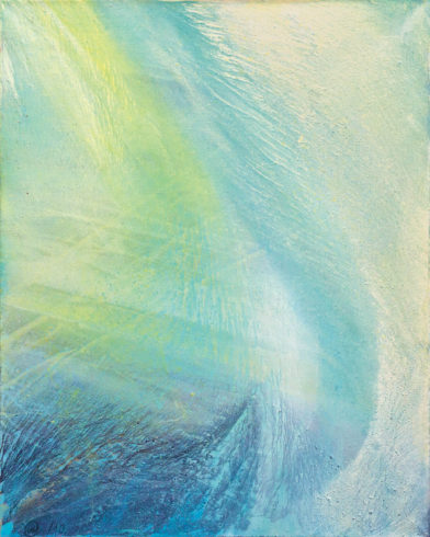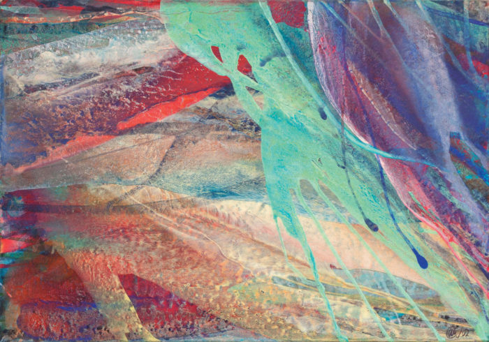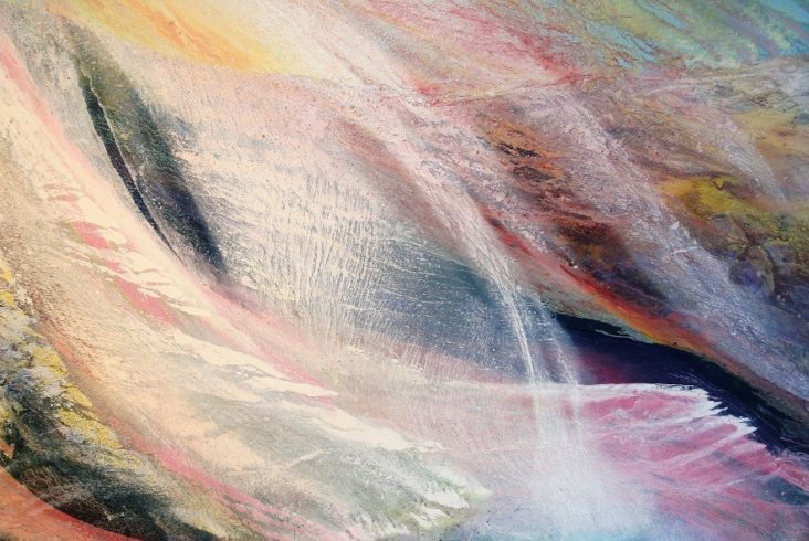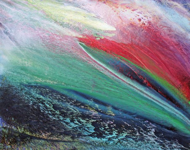 Dabei ist das Wissen über Marcottos bildend künstlerische Arbeitsweise für das Verständnis seines schriftlichen Werkes von wesentlicher Bedeutung. Der Schlüssel dazu liegt in der Marcotto’schen Schütttechnik, bei der Farbe schichtweise am Rande der Abstraktion immer wieder über die Leinwand nicht gemalt, sondern mit mehr oder weniger Energie geschüttet und geworfen wird. Ziel dabei ist ein scheinbar strenger Zusammenhalt der sich aus Schütten und Werfen ergebenden Teile. Sie sind für sich erkennbar, ergeben aber am Ende in sich verästelt als gegenseitige Fortsetzungen ein gemeinsames Ganzes: eine morphogenetische Einheit, die scheinbar durch ein inhärentes Licht zusammengehalten wird. Dieses Licht ermöglicht Tiefe und Räumlichkeit und trägt eine unverwechselbare Stimmung. In Marcottos Bildern gibt das Licht den Ton an. Und so wie das Licht der Ton ist, ist das Wasser die Melodie. Denn erst die Beimischung von Wasser zu Farbe erzeugt unterschiedliche miteinander spielende und kommunizierende Farbintensitäten, die einander anziehen oder abstoßen, bis alles in eine Komposition aus Farbe, Elementen und Licht aufgeht. Leitend sind bei der Werkgestaltung seine Emotionen. Sie ermöglichen am Ende die Schüttgeste, den entscheidenden Wurf, der die Verbindungen zwischen den einzelnen Teilen zueinander ermöglicht und schließlich ein Ganzes erschafft und Cesare Marcottos Sinnlichkeit ins Bild fließen lässt. (…) Damit lässt uns Cesare Marcotto an seiner Interpretation der Heraklid’schen „Panta-rhei“-Idee teilhaben. (…)